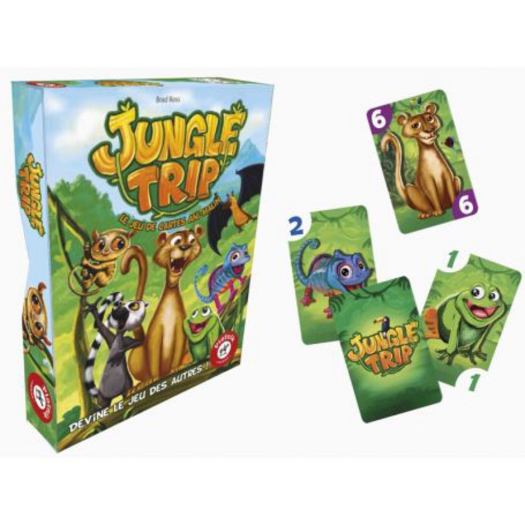 à partir de 5 ans moins de 30 min 2 à 5 joueur(s) Grenouilles de Madagascar, roussettes, caméléons et autres singes. Tu risques fort de croiser ces drôles d'animaux dans ce jeu de cartes animalier et malin ! Pose adroitement tes cartes pour gagner le plus de plis et remporter la partie ! Jungle Trip se joue en plusieurs manches. On joue toujours tous en même temps. Chaque joueur choisit une carte de son jeu et la place devant lui face cachée. Une fois que tous les joueurs ont posé leur carte, tout le monde retourne sa carte et la place au milieu de la table: S'il n'y a que des cartes avec des chiffres différents, c'est le joueur qui a posé la valeur la plus élevée qui remporte le pli. S'il y a deux cartes ou plus possédant la même valeur, ces cartes s'annulent mutuellement, le pli est alors remporté par le joueur qui a posé la carte avec la valeur la plus haute et qui n'est présente sur aucune autre carte.