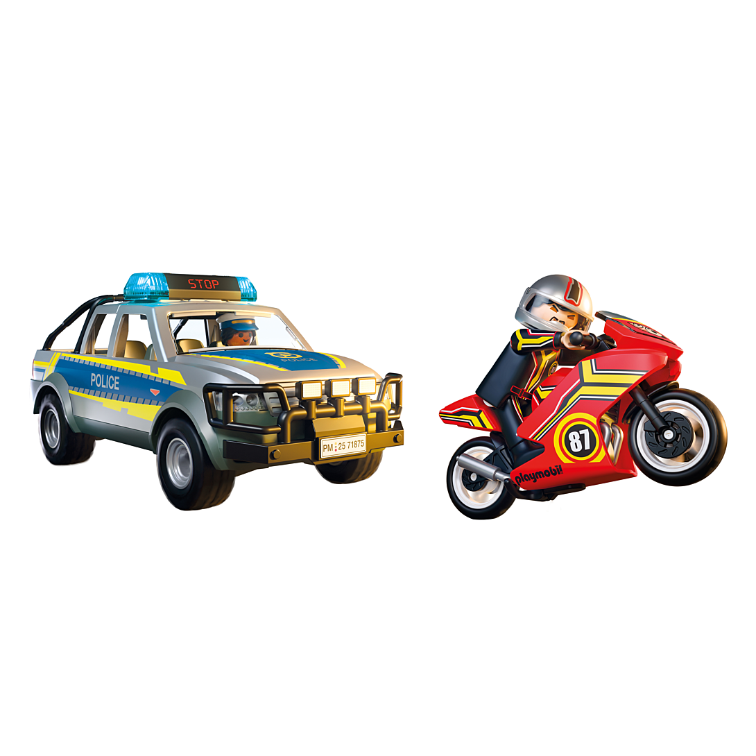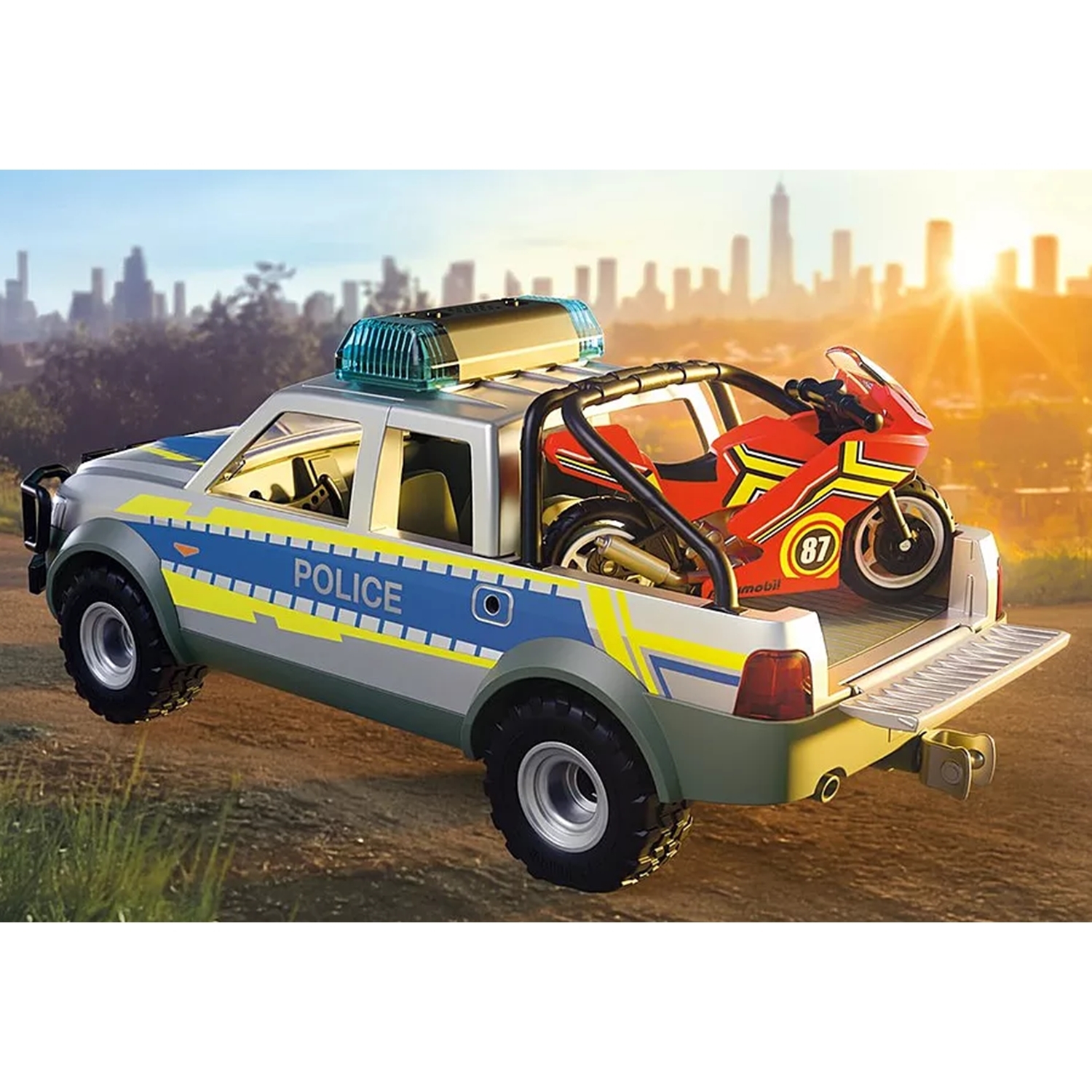 Personnages : 1 policière, 1 malfaiteur Accessoires : 1 pick-up avec pare-buffle et plateau de chargement, 1 module son et lumière de police, 1 moto, 1 casquette de police, 1 gilet pare-balles, 1 pistolet avec support, 1 casque de moto, 1 ruban à clous