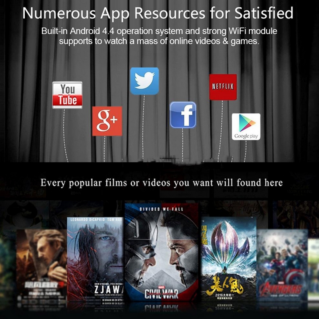 Ce vidéoprojecteur est équipé d'un système Android 4.4, d'un espace de stockage de 1GB+32GB et d'une capacité de support de carte mémoire allant jusqu'à 64GB. Il propose également une connexion WiFi 2.4GHz / 5GHz, pour une transmission rapide et sans stress des données. De plus, il peut lire directement les données d'un disque dur, d'une clé USB ou d'une carte SD. Il peut également se connecter sans fil à un téléphone mobile, un iPad ou un ordinateur, pour une utilisation encore plus facile et flexible.