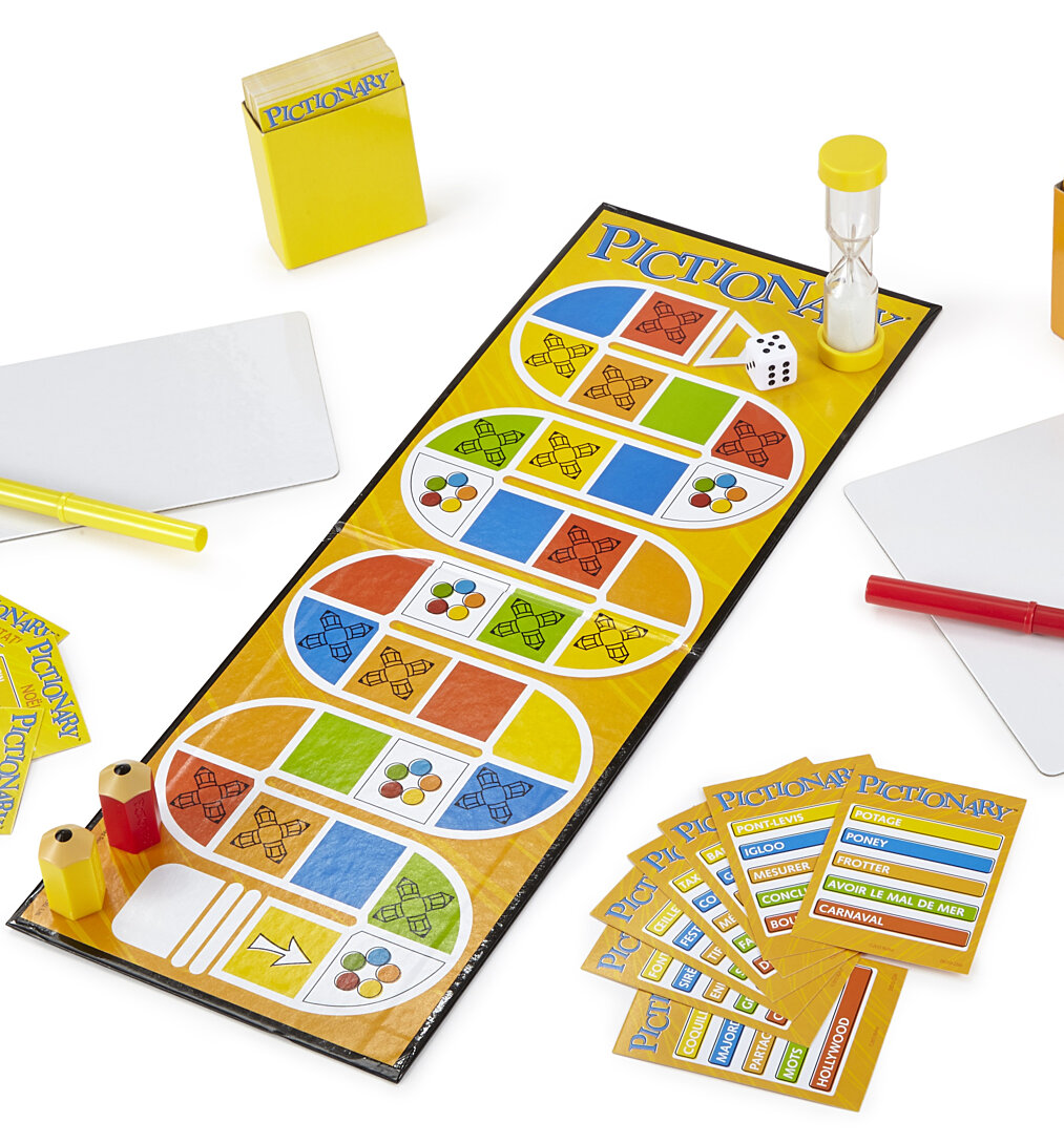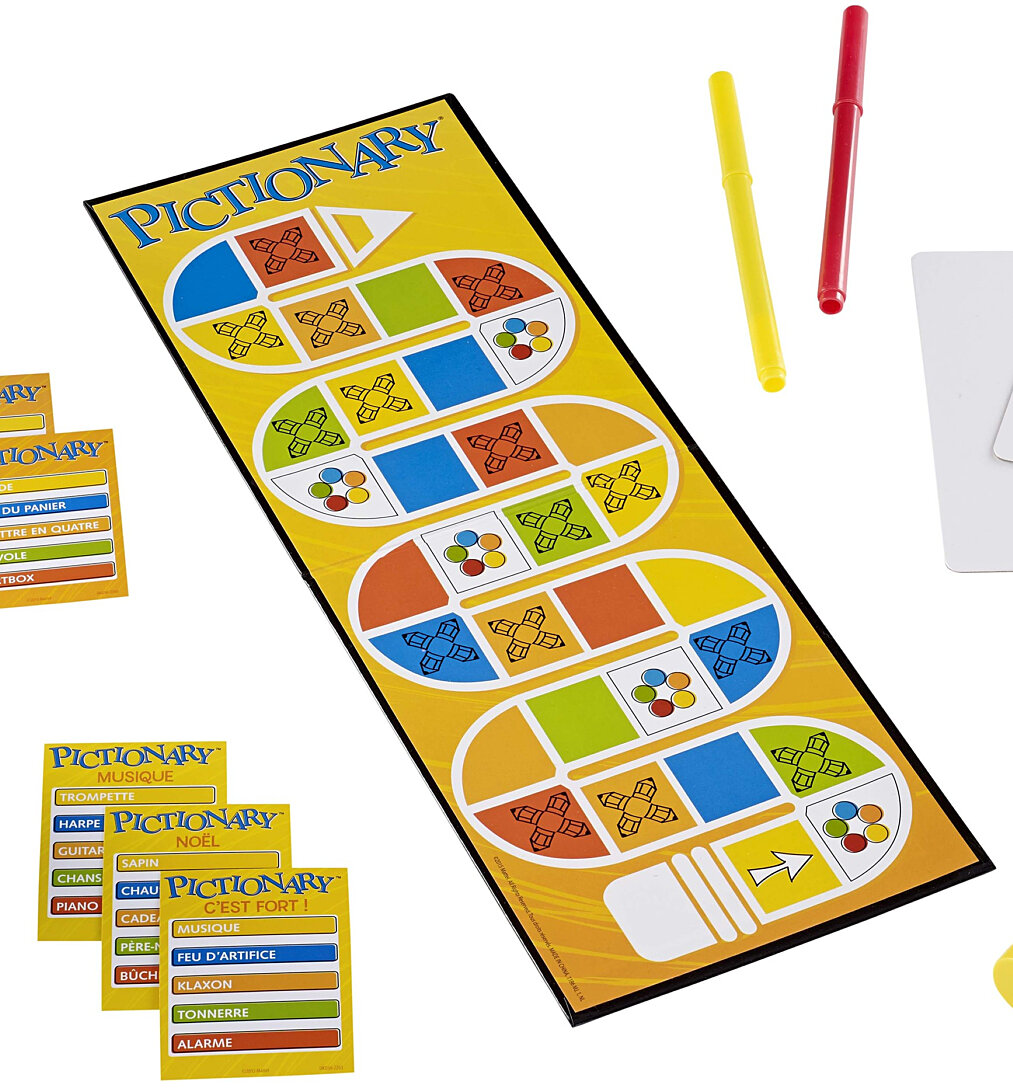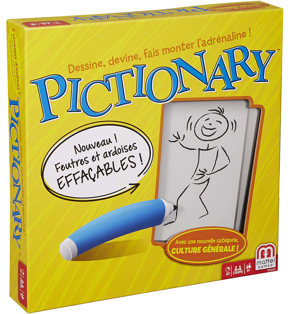 | Plus produit | Un classique du jeu de dessin depuis 1985.\nFous rires garantis !\nLes participants sont parfois plus drôles que les devinettes à dessiner !\nComprend deux feutres effaçables, un tableau et de nouvelles cartes mises à jour. |