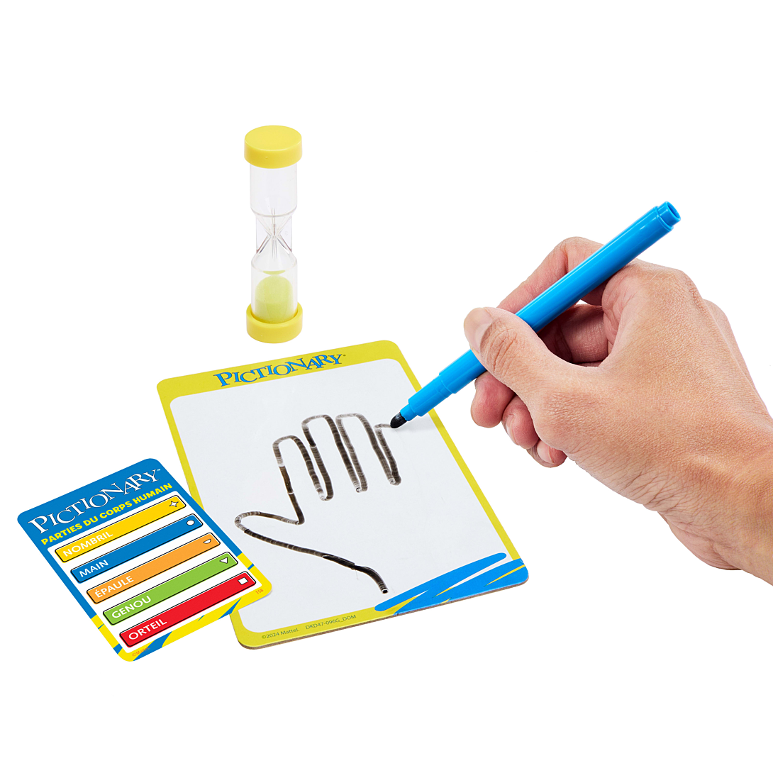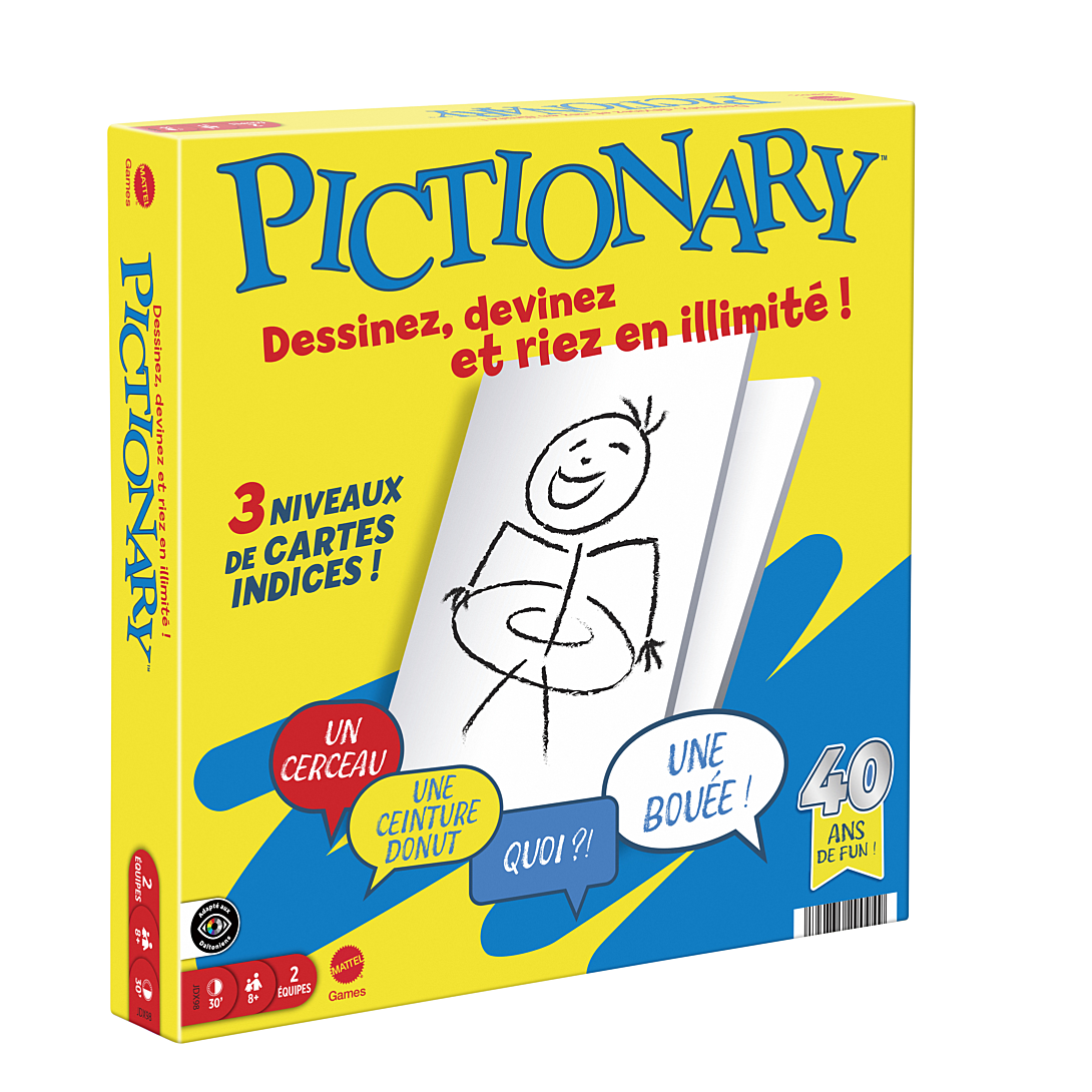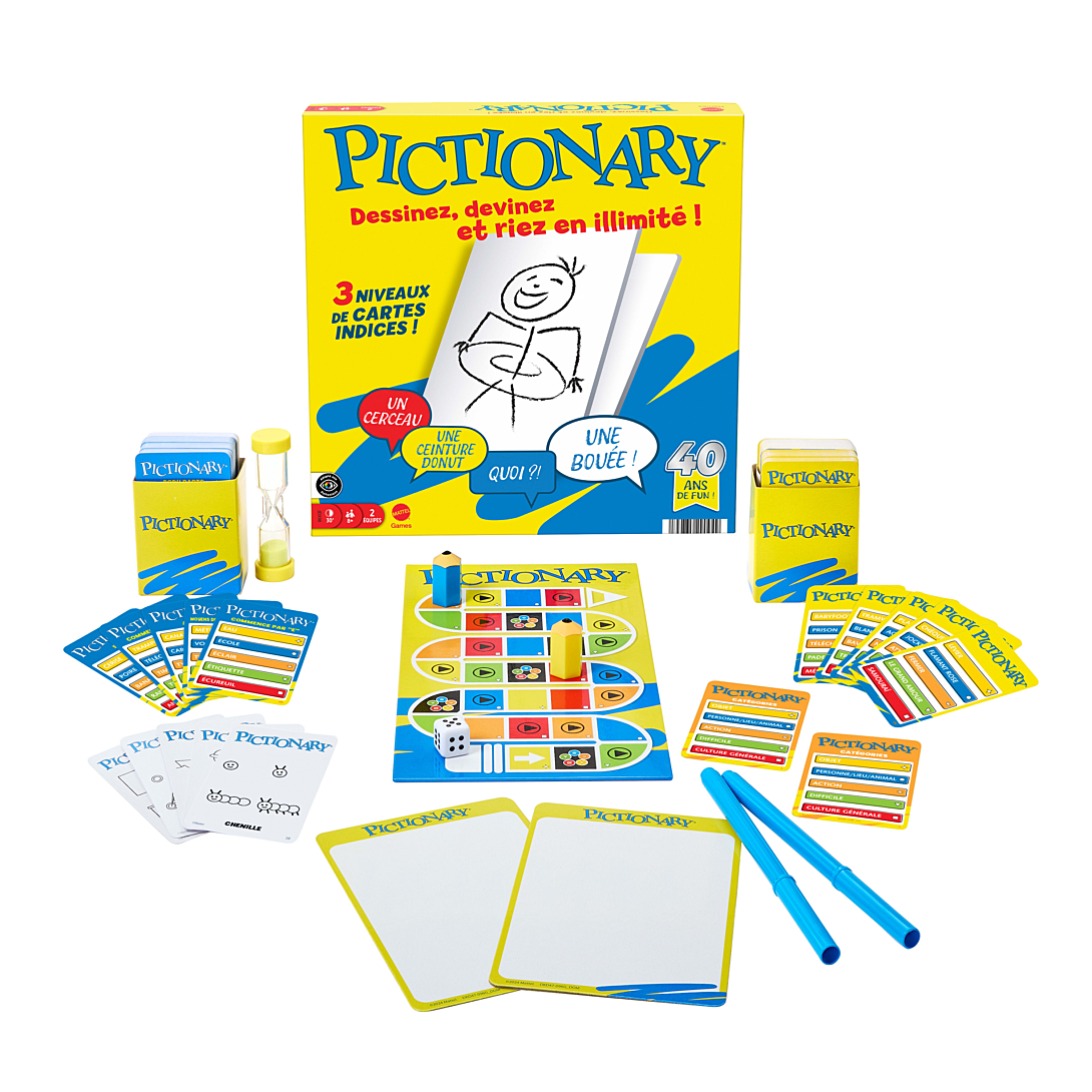 Le Pictionary est un jeu de société familial intemporel qui consiste à réaliser rapidement des dessins et proposer des suggestions souvent très drôles ! Dans ce jeu vraiment très amusant, à tour de rôle, un membre d’une équipe réalise un dessin tandis que le reste de l’équipe doit deviner de quoi il s’agit. Choisissez parmi 3 niveaux d’indices afin que même les plus jeunes puissent participer. Nul besoin d’être un artiste. Souvent, les suggestions sont encore plus hilarantes que les croquis !