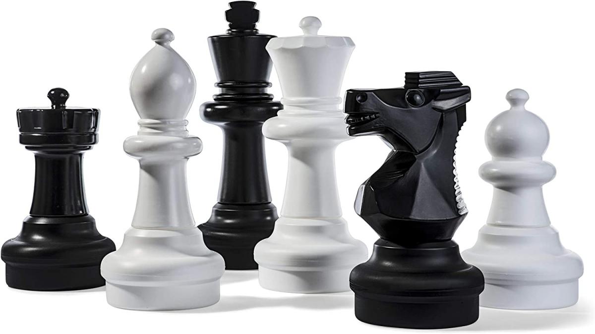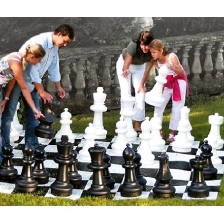 eu d'échec ULTRA géant XXL pour animations, campings, centre de loisirs, place de ville ou village. Hauteur du roi : 63 cm. Pièces de jeux échecs géantes en plastique pour extérieur. Grand échecs plastiques dur très résistant pour dehors. Détail des pièces ci-dessous. 32 pièces en plastique de haute qualité (16 pièces noires et 16 pièces blanches. Fabricant Rolly toys (Allemagne).