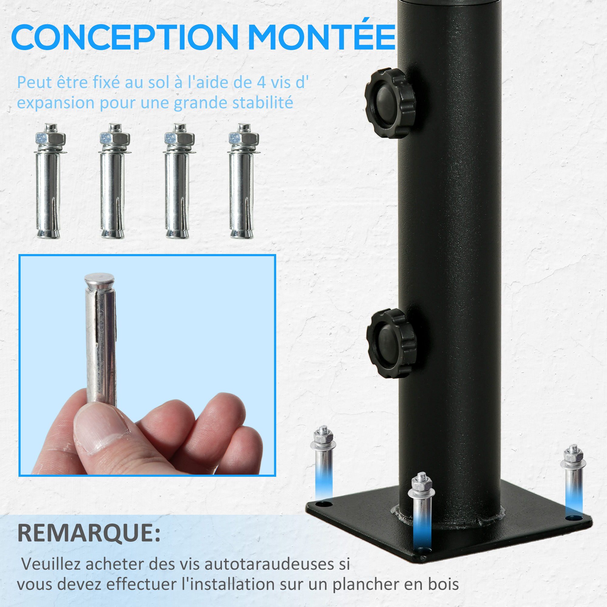 - 4 vis fixent le support de parasol au sol en béton pour une haute stabilité