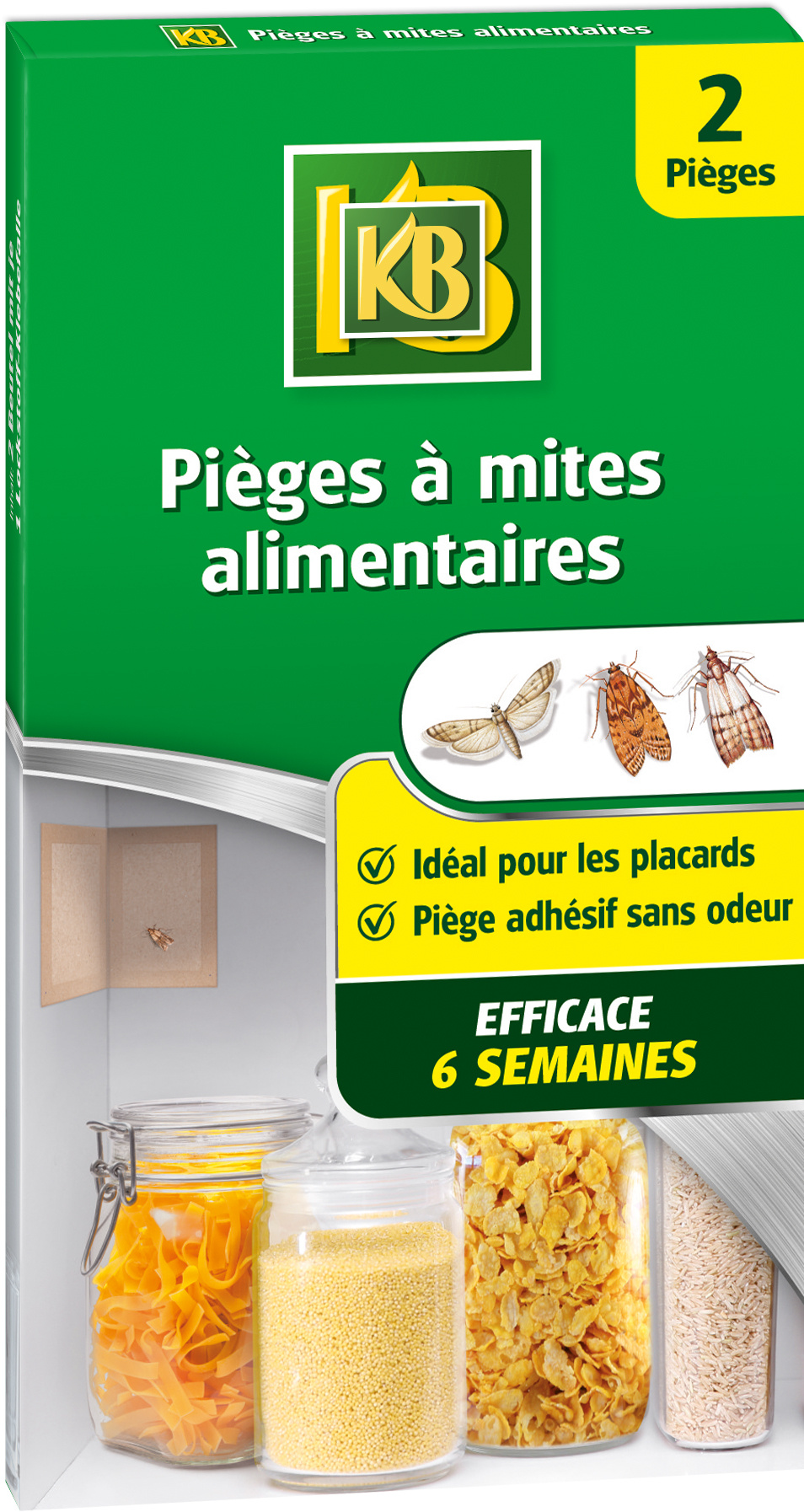 Le piège à mites KB est un piège adhésif inodore, prêts à l'emploi et efficace 8 semaines. Sa forme en V permet de le poser sur les étagères ou dans les placards et tiroirs des lieux de stockage des aliments (cuisines, salons, caves, buanderies ...). Produit destiné à être utilisé exclusivement à l'intérieur, là où sont entreposées des denrées alimentaires (pour l'homme ou pour un animal).