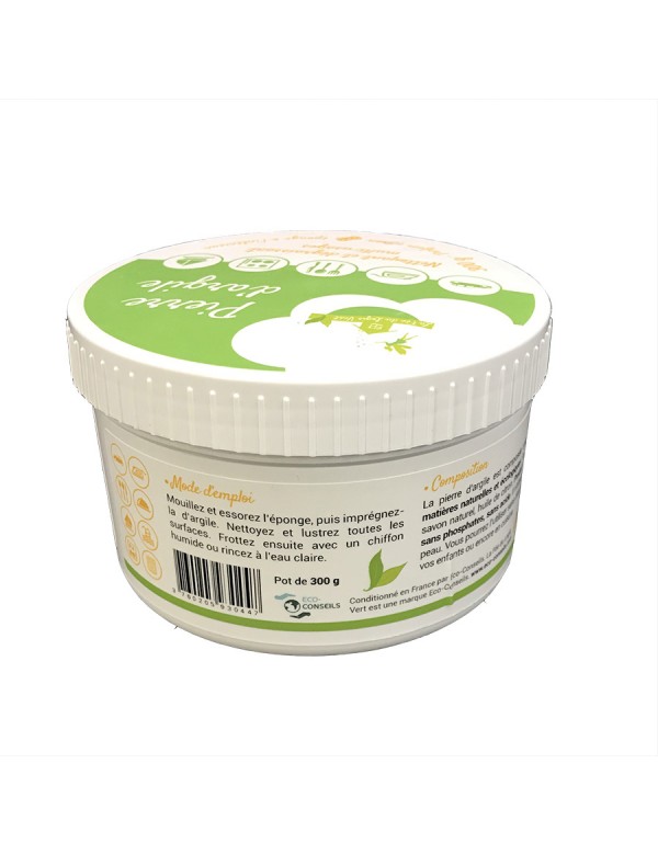Elle entretient, soigne, ravive et imperméabilise. Un nettoyant universel : La Pierre d’Argile remplace de nombreux produits d’entretien spécialisés. Elle nettoie, entretien, dégraisse, enlève le tartre, polit et protège, sans rayer ! Elle laisse un léger parfum naturel de citron. Un produit 100% naturel : La Pierre d’Argile est composée d’argile blanche, d’huile essentielle de citron, d’eau et de savon naturel. C’est un produit non toxique sans phosphate, ni acide. Il n’attaque pas votre peau. Vous pourrez ainsi l’utiliser sans danger auprès de vos enfants ou encore en cuisine. Un produit économique : La Pierre d’Argile ne se dégrade pas avec le temps, et vous n’avez besoin que de très peu de produit pour nettoyer une multitude de surfaces et objets. Vous pourrez donc utiliser ce pot de 300g pendant plusieurs mois. - En cuisine : vitrocéramique, gazinière, vitre et grilles de four, plats brûlés ou graisseux, vaisselle... - Dans votre salon : insert de cheminée, joints de carrelage, vitres... - Dans votre salle de bain : lavabo, porte de douche, joints de salle de bains, robinetterie, bac à douche, baignoire, WC... - Autres utilisations : nettoyez votre fer à repasser, vos outils, vos murs et papiers peints, redonnez brillance à vos bijoux, lavez votre mobilier de jardin, tableau de bord et jantes de voiture, camping-car, coque de bateau, blanchissez les semelles de vos chaussures... - Utilisable sur tout type de surfaces lavables à l’eau : plastiques, inox, cuivre, chrome, étain, aluminium, argenterie, acrylique, émail, carrelage, pierre, lino, vitre, laiton, cuir...