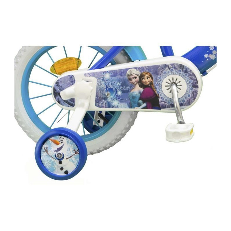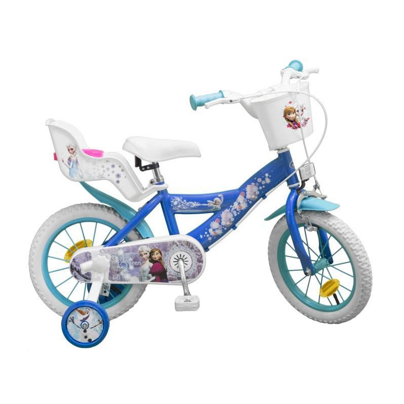 Vélo 14 pouces " La Reine des Neiges" avec casque pour que les enfants de 4 a 6 ans, apprennent a pédaler et a rouler comme les grands. Cadre et fourche acier. Équipé pour assurer la meilleure qualité et sécurité a votre enfant. Des autocollants déco a l'effigie de son personnage " La Reine des Neiges" préféré sont inclus. Fabriqué en Europe.