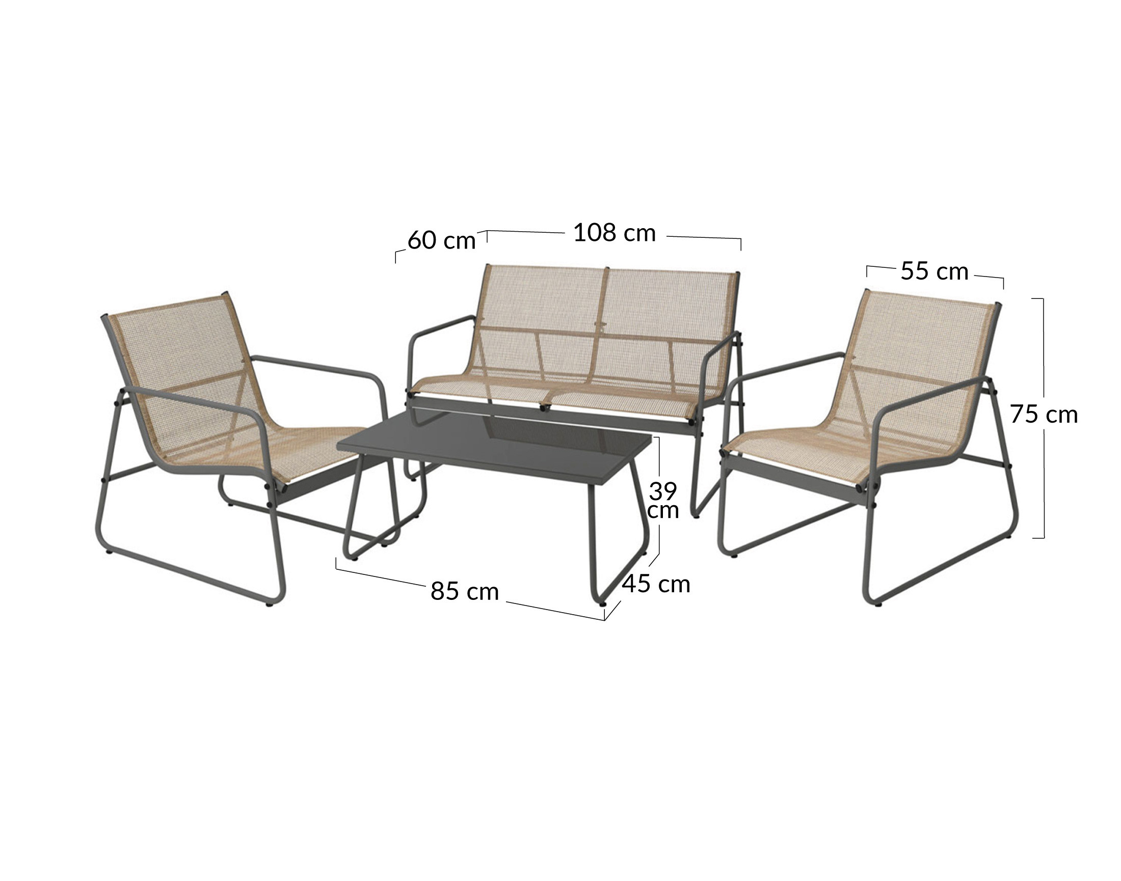 Le salon de jardin Pilar est robuste car il est conçu avec des matériaux adaptés à un usage extérieur. Sa structure est confectionnée en métal et son assise et son dossier sont en résine tressée synthétique. La table basse, quant à elle, est fabriquée à partir de métal avec un plateau en verre.