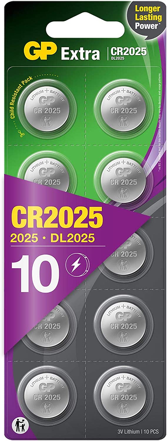 Piles CR2025 - Lot de 10 Piles | GP Extra | Batteries CR 2025 Lithium 3v - Longue durée pour dispositifs