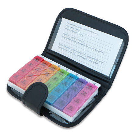 Pilulier semainier avec un module pour chaque jour de la semaine et 4 cases par module (jusqu'à 4 prises par jour). Étui portefeuille inclus. - 7 modules pour 4 prises journalières (matin, midi, soir, nuit). - Modules amovibles facilitant le remplissage des médicaments. - Avec pochette à ouverture et fermeture par scratch. - Se glisse facilement dans un sac. - Sans bisphénol A. Poids : 172 g. Taille : 19,2 x 12,2 x 3,5 cm.