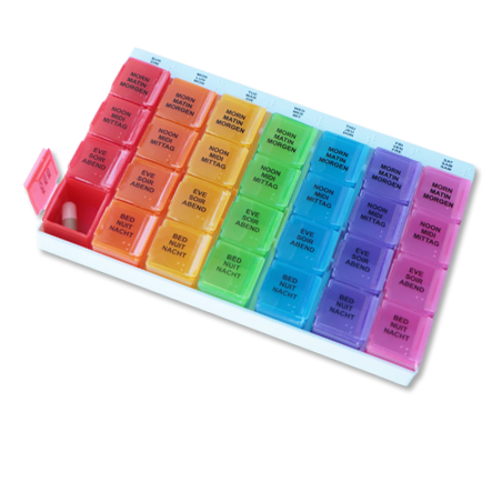 Pilulier semainier avec un module pour chaque jour de la semaine et 4 cases par module (jusqu'à 4 prises par jour). Étui portefeuille inclus. - 7 modules pour 4 prises journalières (matin, midi, soir, nuit). - Modules amovibles facilitant le remplissage des médicaments. - Avec pochette à ouverture et fermeture par scratch. - Se glisse facilement dans un sac. - Sans bisphénol A. Poids : 172 g. Taille : 19,2 x 12,2 x 3,5 cm.