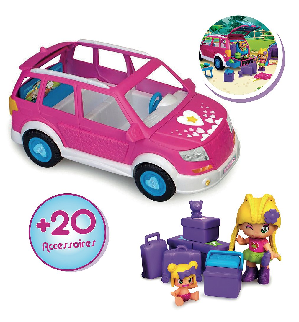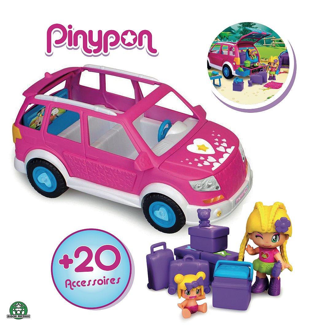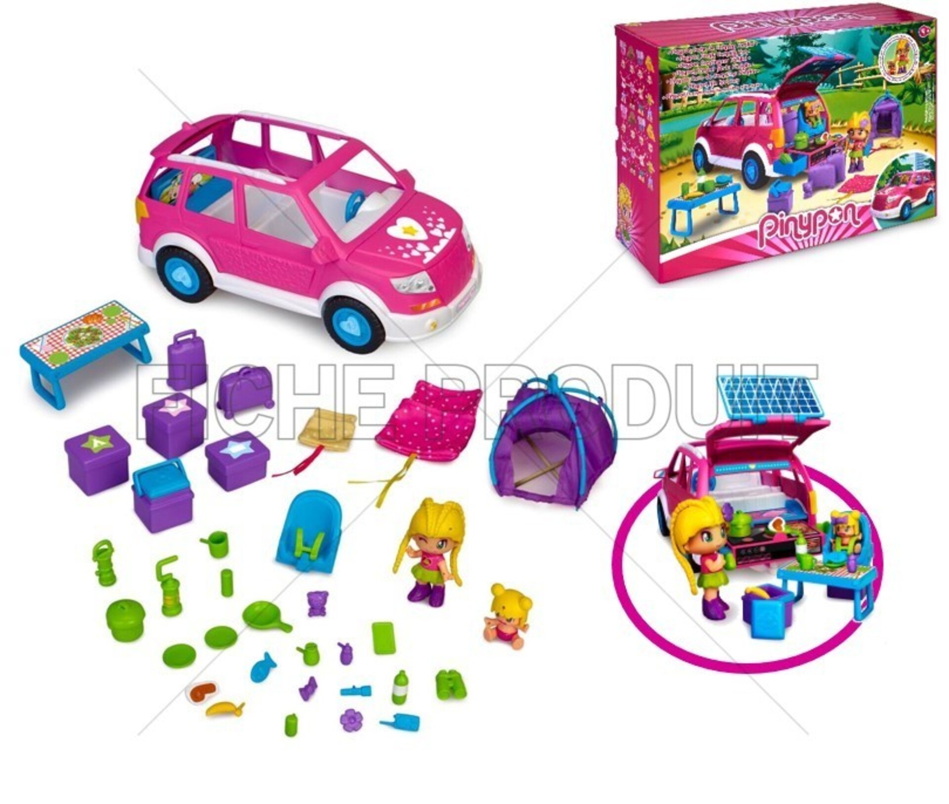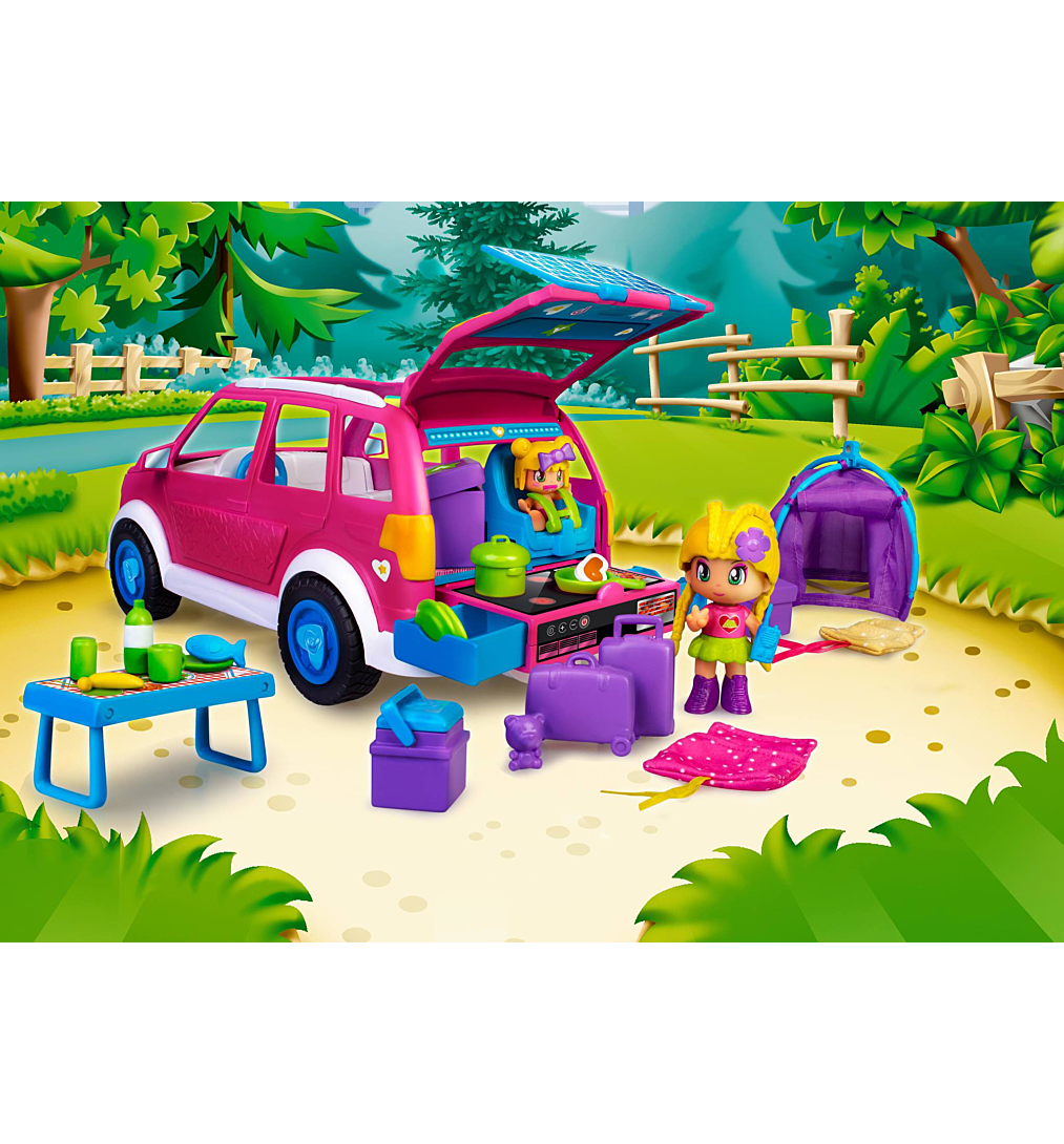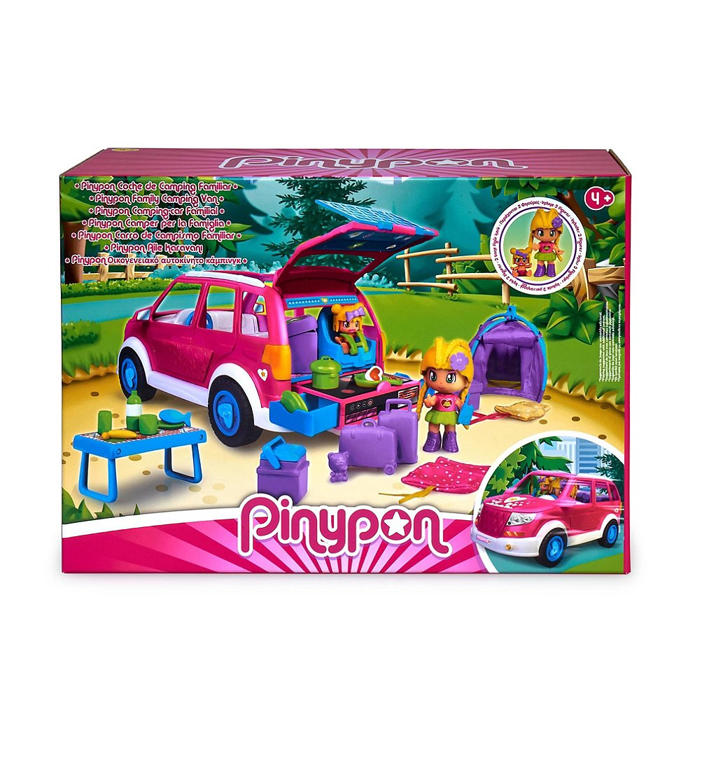 Tes Pinypon au volant de leur nouveau Camping Car familial ! Coloré et plein d’accessoires, tout est prêt pour aller faire camping! Contient une cuisine convertible dans le coffre, un siège de voiture pour le bébé, une table de pique-nique, deux valises, une tente avec deux sacs de couchage et des valises, et plein d’autres accessoires. Inclus 2 figurines (maman & bébé) ainsi que + de 30 accessoires !