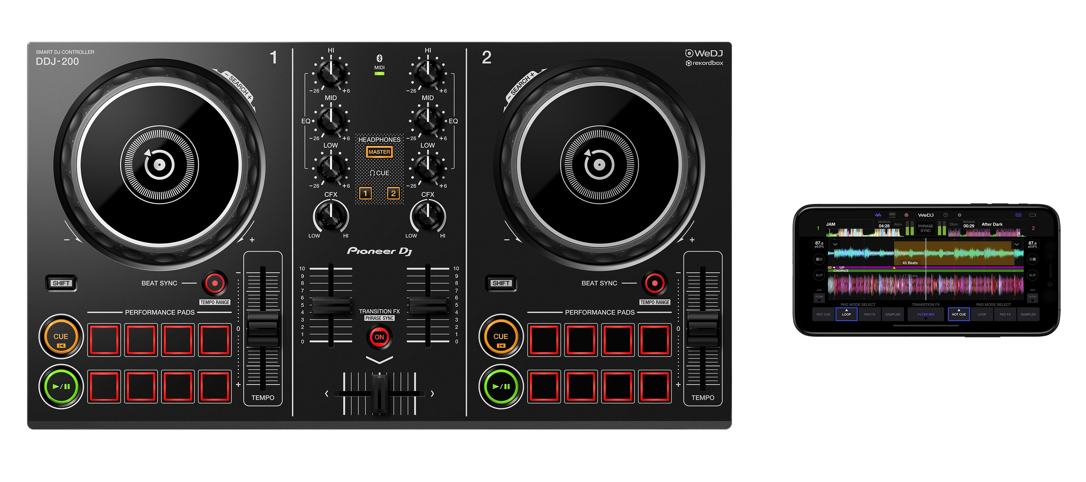 Pioneer DDJ-200. Connecteur USB: USB Type-B. Type d'alimentation d'énergie: USB, Tension d'entrée: 5 V, Actuel: 0,5 A. Prise en charge du système d'exploitation Windows: Windows 10, Windows 7, Windows 8.1, Prise en charge du système d'exploitation Mac: Mac OS X 10.12 Sierra, Mac OS X 10.13 High Sierra, Mac OS X 10.14 Mojave, Processeur minimal: Inter Core i7/i5/i3. Type d'emplacement de verrouillage de câble: Kensington. Largeur: 378 mm, Profondeur: 208 mm, Hauteur: 48,2 mm