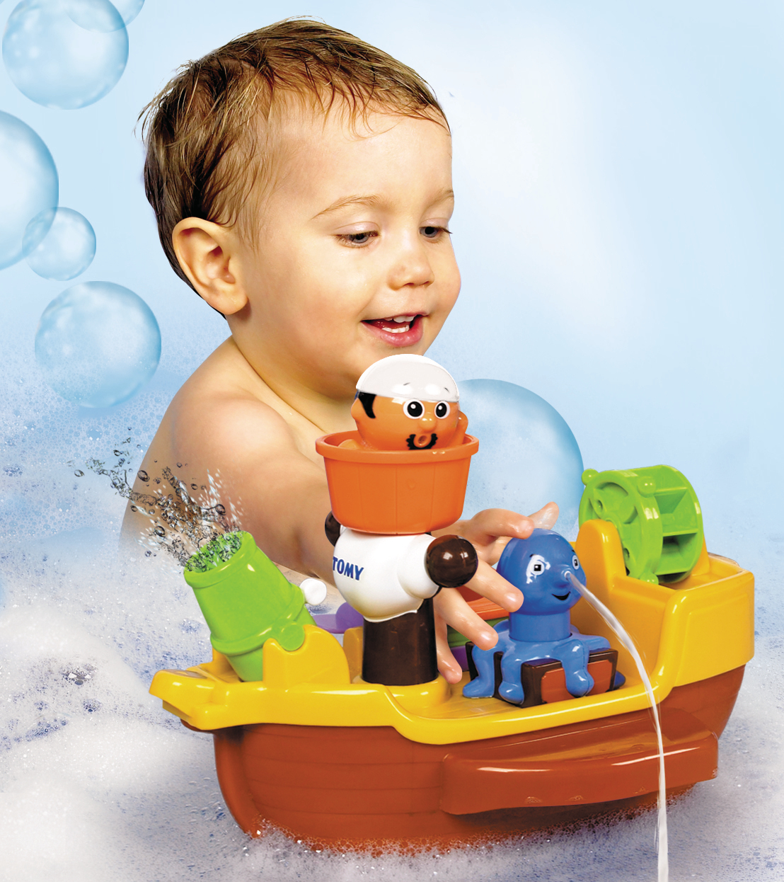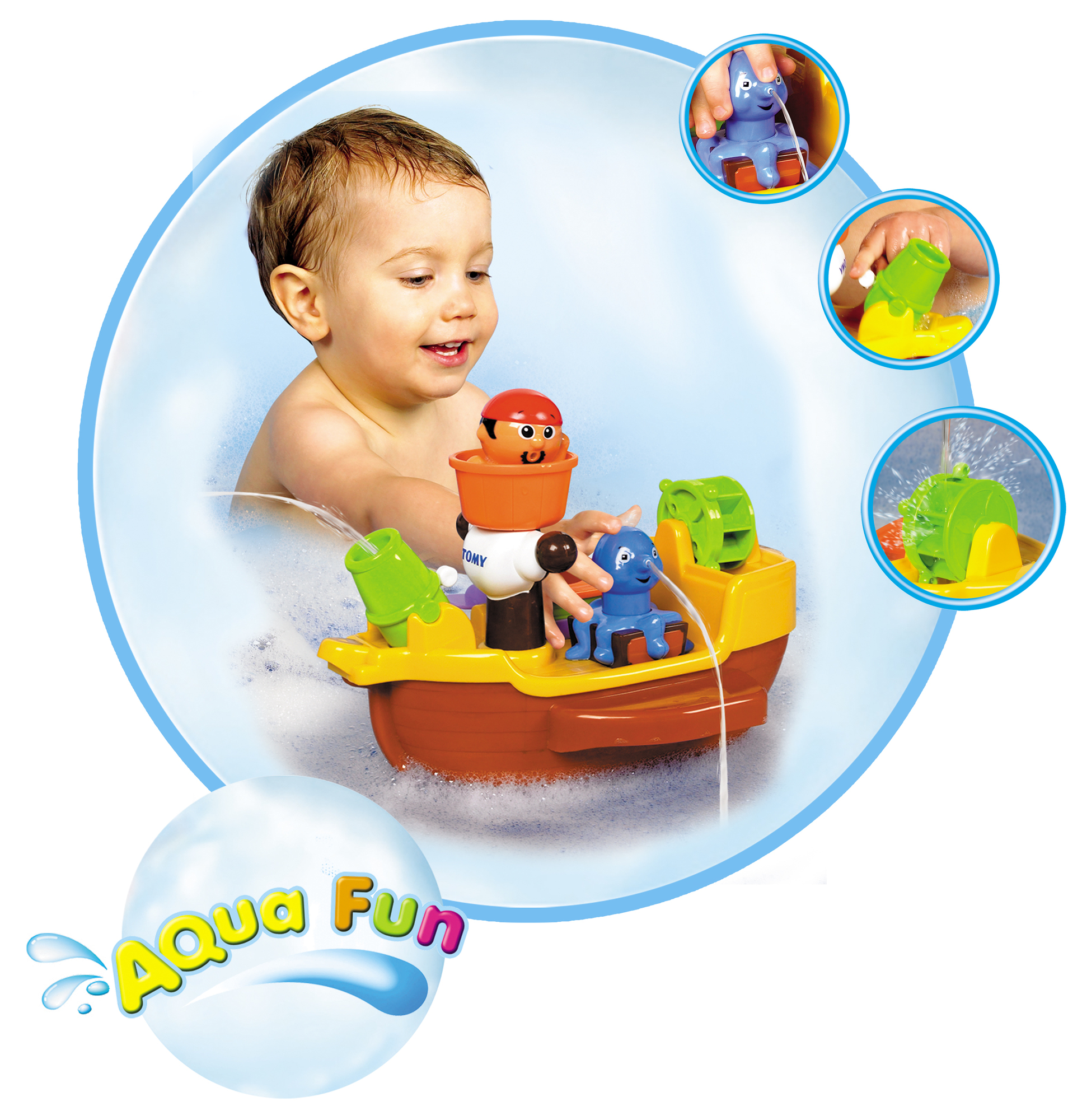 A vos postes moussaillons ! Un pirate en haut du mat ! Une pieuvre au nez aspergeur ! Un caNon qui lance des boulets d’eau ! Un caNont de sauvetage ! Voici un bateau pirate plein d’activités, pour que l’heure du bain ne soit jamais sans intérêt !
