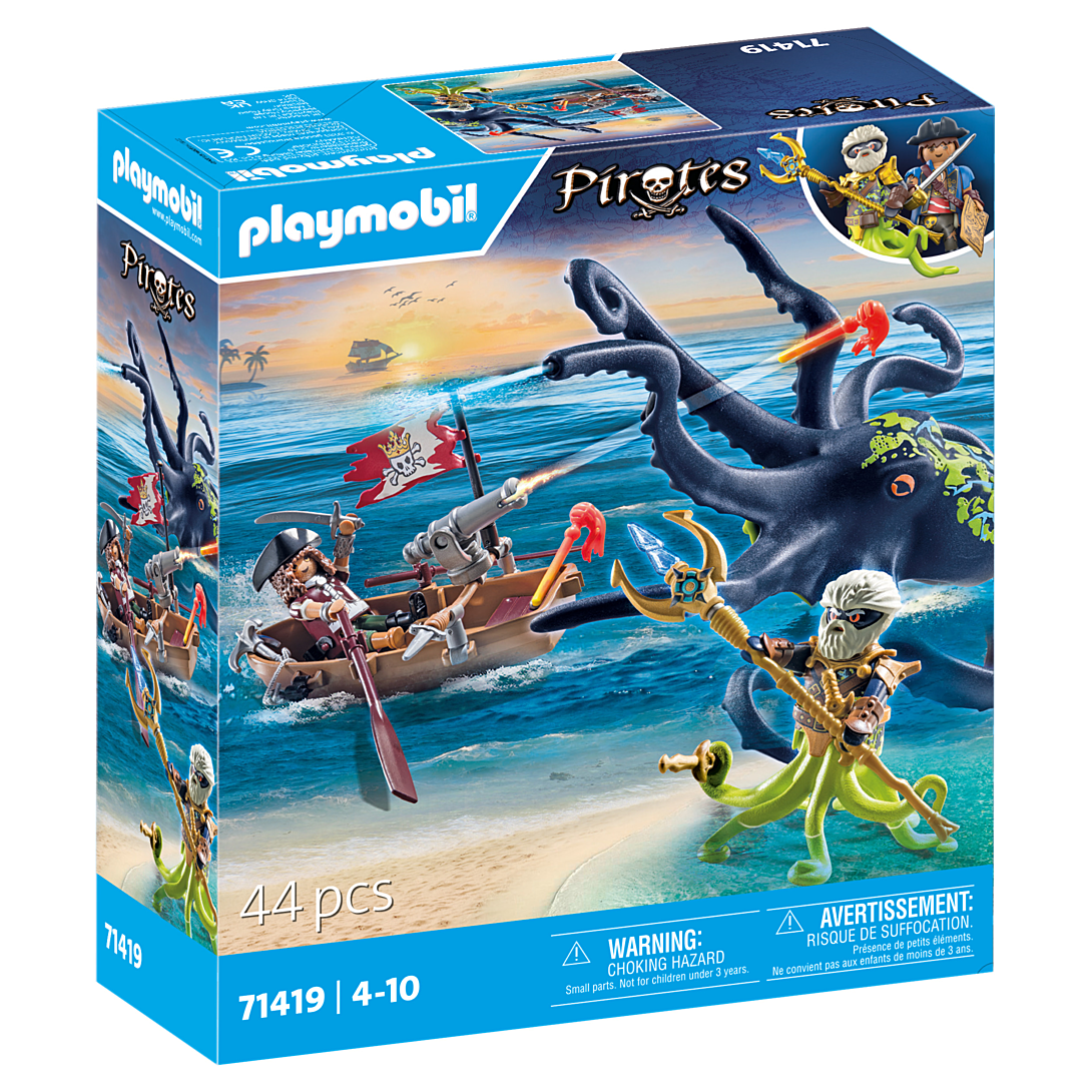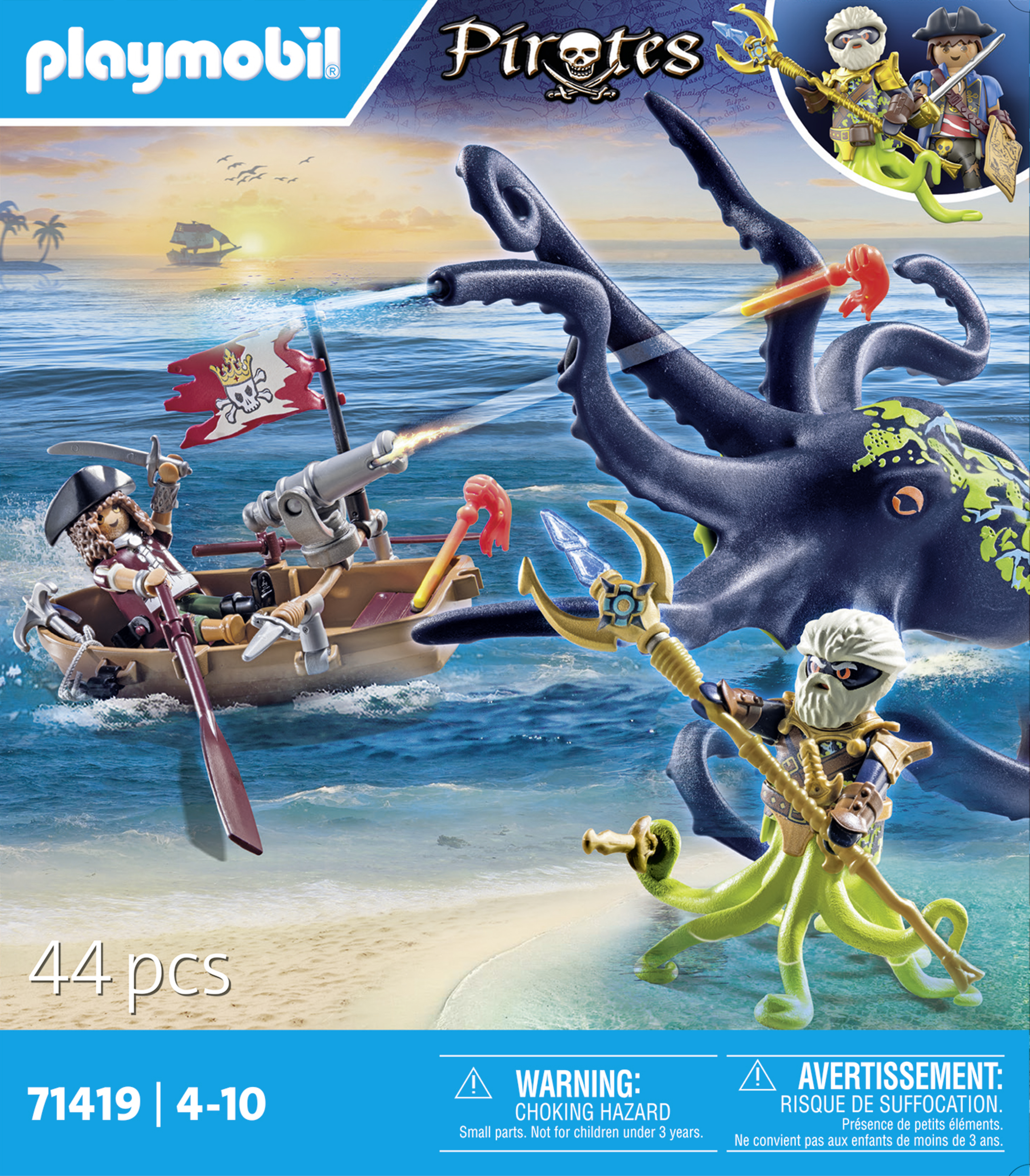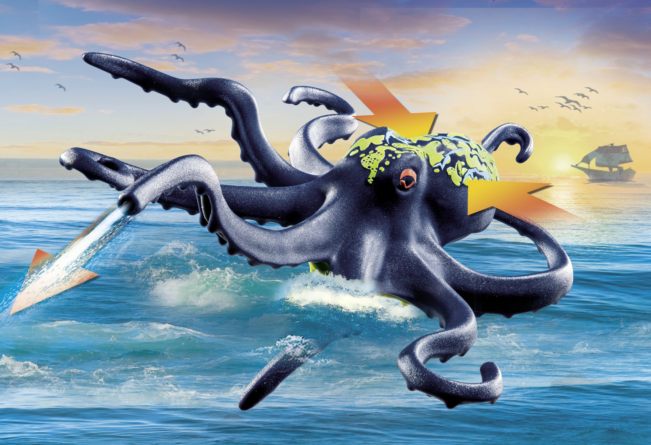 Attention, le géant des fonds marins approche ! Le pirate tente de fuir à bord de sa barque, mais la pieuvre géante et son compagnon Deepers, lui aussi muni de tentacules, sont plus rapides. Ils rattrapent le bateau, et le poulpe déchaîne une rafale d'eau glacée sur le pirate avec ses tentacules. Le malheureux pirate n'a même pas le temps de charger son canon. Défier cette créature marine extraordinaire serait une bien mauvaise idée ! Le crochet, solidement attaché par une corde au bateau, peut être utiliser comme ancre ou être utilisé pour attraper la pieuvre. Cette pieuvre est équipée d'une fonction de projection d'eau innovante. Il vous suffit de remplir le réservoir d'eau situé sous son corps, puis de le comprimer pour déclencher un puissant jet d'eau qui ajoute une dimension passionnante à votre aventure !