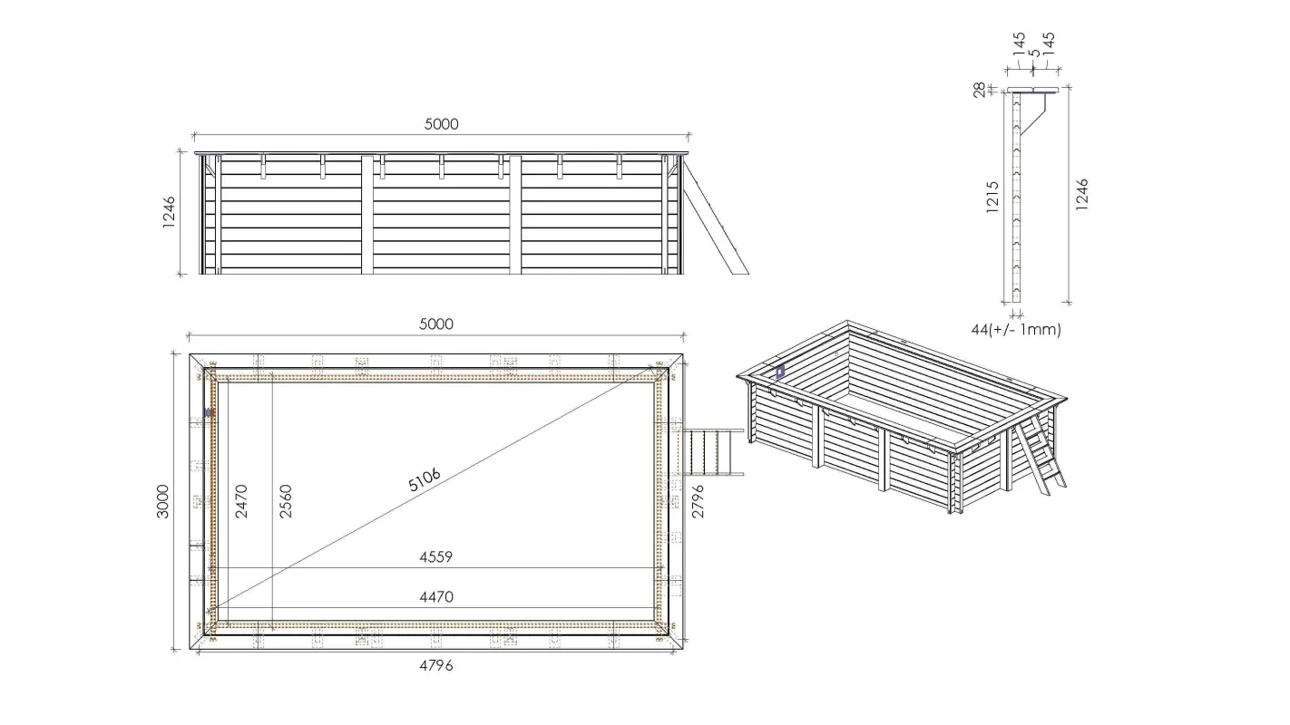 Découvrez notre piscine en bois de dimensions 5 m x 3 m et d'une hauteur de 1,25 m, fabriquée en bois de pin, imprégnée dans la couleur vert. L'épaisseur des planches est de 44 mm (+/- 1mm), garantissant une construction très solide pour la piscine. L'épaisseur des planches de terrasse est de 28 mm.