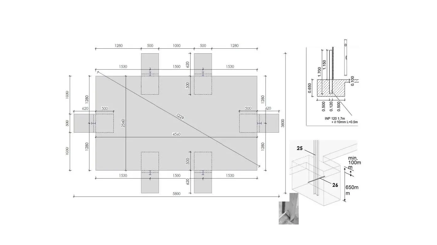 Avant de commencer les travaux de construction, il est important de prendre en compte que les supports métalliques IPN sont fournis avec la piscine. La préparation du sol doit uniquement inclure un nivellement adéquat du terrain, tandis que le coulage du béton ne doit être effectué qu’après la réception de l’ensemble complet, afin d’ancrer correctement les supports dans les fondations. Il est recommandé de réaliser une dalle en béton d'une épaisseur minimale de 10 cm sous l’ensemble de la piscine et d’au moins 65 cm pour les supports IPN. Toutefois, cette dalle ne doit pas être coulée avant l’installation des IPN.