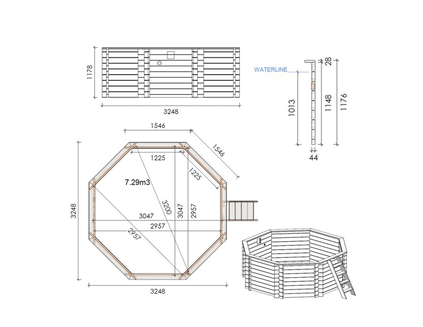 Découvrez notre piscine en bois de dimensions 3.25 m x 3.25 m et d'une hauteur de 1.18 m, fabriquée en bois de pin, imprégnée dans la couleur vert. L'épaisseur des planches est de 44 mm (+/- 1mm), garantissant une construction très solide pour la piscine. L'épaisseur des planches de terrasse est de 28 mm.