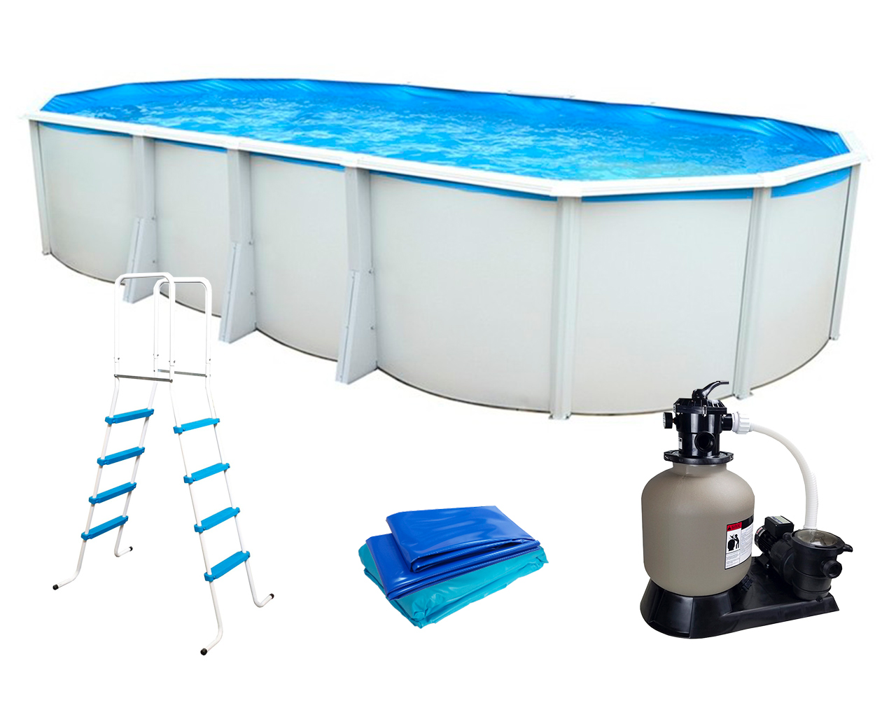 Kit piscine hors-sol Toi IBIZA ovale 915X457X132cm. Parois acier laquées, filtre à sable 8m³h, liner épaisseur 40 microns uni bleu, margelles blanches en acier laqué, contreforts enterrés, 3 contreforts extérieurs de chaque côté en acier...