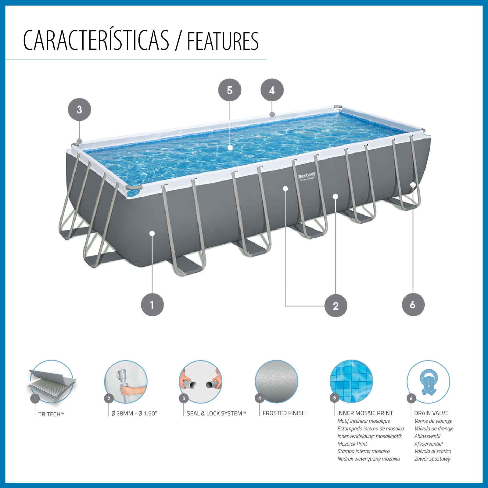 | Libellé | Piscine Tubulaire Rectangulaire Bestway Power Steel 640x274x132 cm Filtre à Sable Échelle, Couverture et Distributeur Gris |