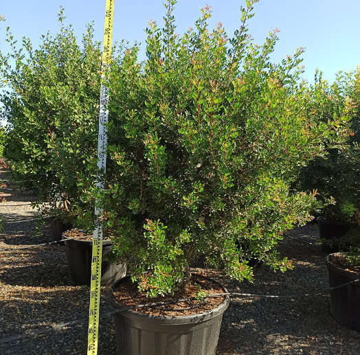 cette plante tolérante à la sécheresse et à la chaleur présente des feuilles vertes vives et brillantes sur des branches lisses et rougeâtres.
