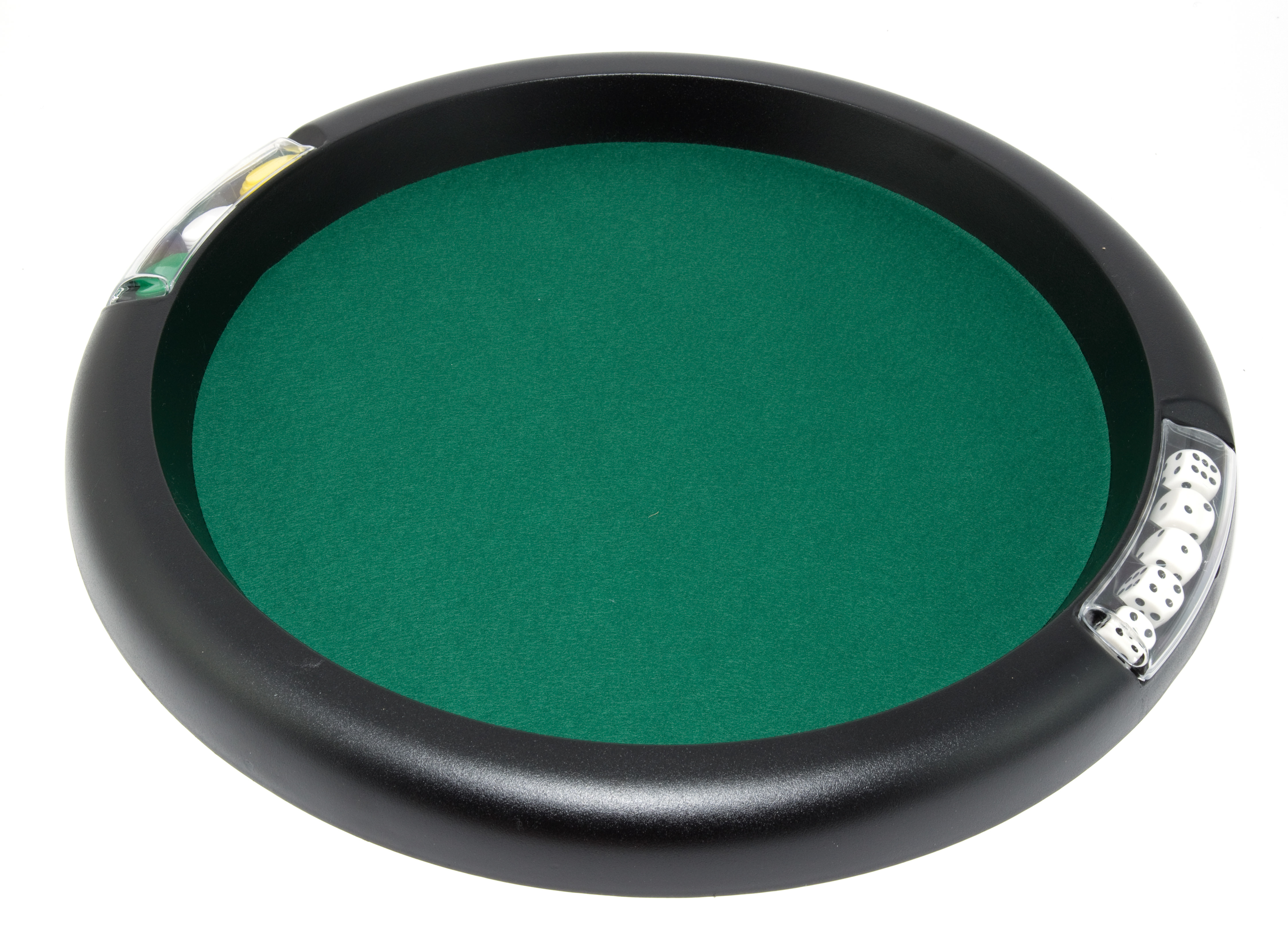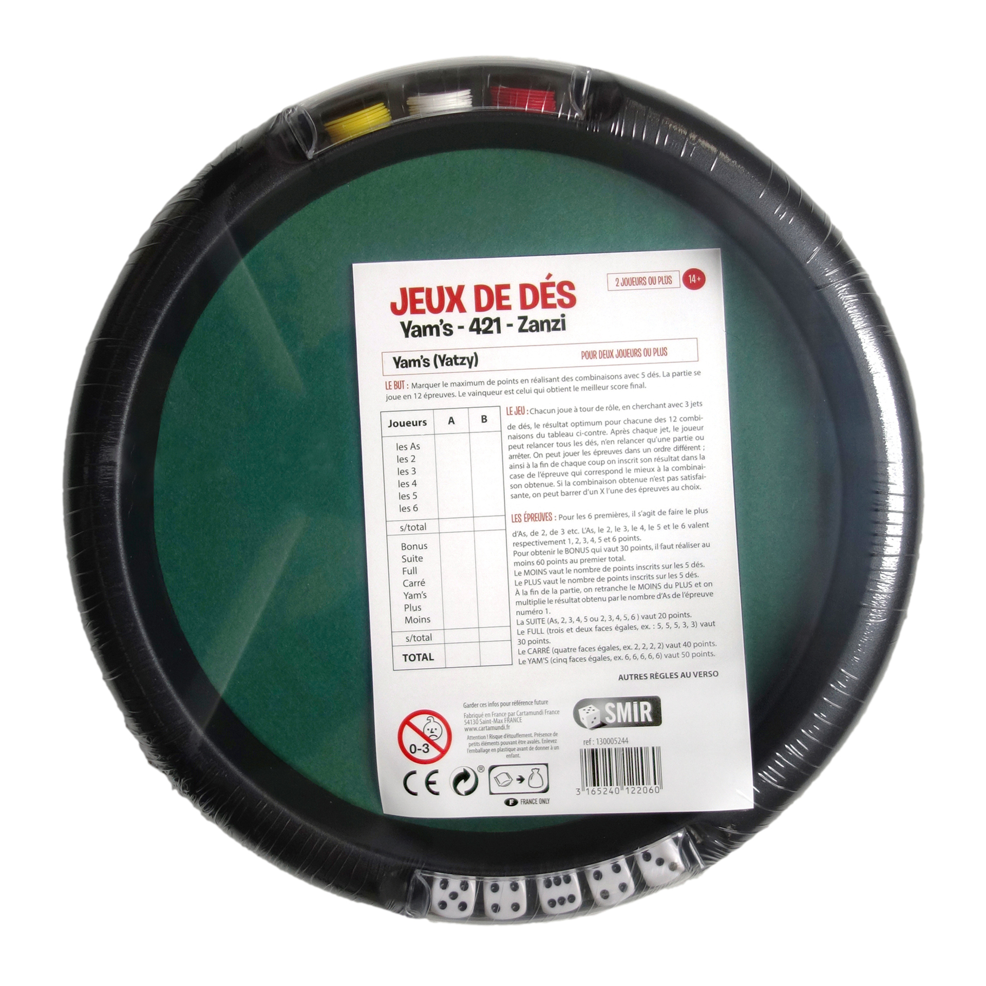 Piste de jeu contenant 5 dés de Yam's et 21 jetons.