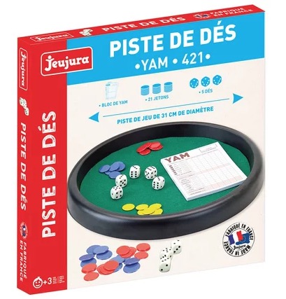 Piste de Dés - Yam - 421 : piste de dés avec 5 dés, 21 jetons et 1 bloc de Yam pour marquer les points - règles des jeux. Diamètre : 31 cm (épaisseur : 3 cm). A partir de 3 ans