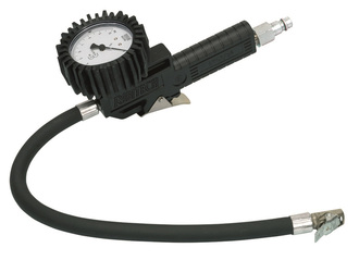Pistolet de gonflage équipé d'un manomètre indicateur de pression avec graduation de 0-10 bars et d'un couvercle de protection en caoutchouc.
