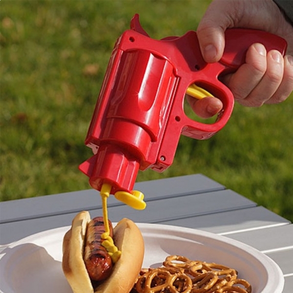 Éloignez de votre vieille routine grâce à ce tir sauce ketchup ou mayonnaise en forme de pistolet.A la fois amusant,insolite par sa forme,ce pistolet à sauce épatera et ravira surement vos invités lors de vos festins en famille.* Dimensions : 16 x 22 cm * Diamètre barillet : 6 cm * Flacons : 100 ml chacun * Matière : plastique Fonctions : distributeur de sauce Contenu : 1 pistolet distributeur de sauce