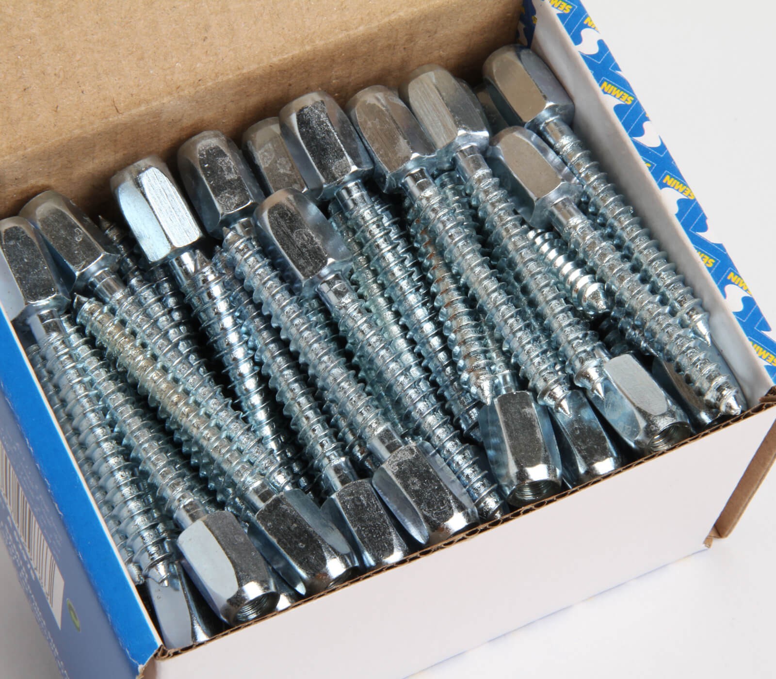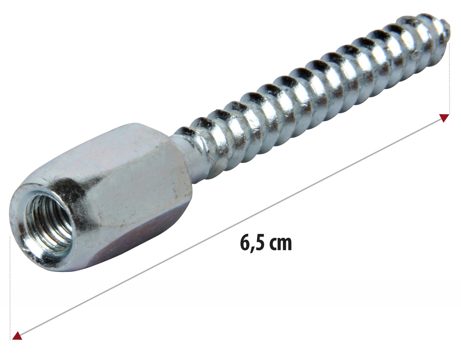 Après avoir percé un trou dans le bois, visser le piton femelle, insérer ensuite la tige filetée dans le piton femelle et le cavalier pivot sur la tige filetée.