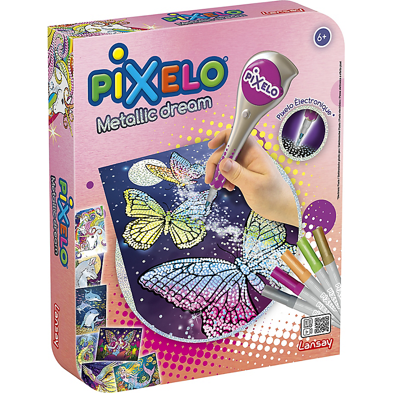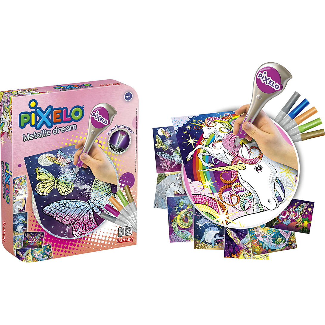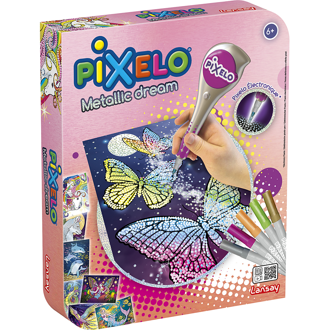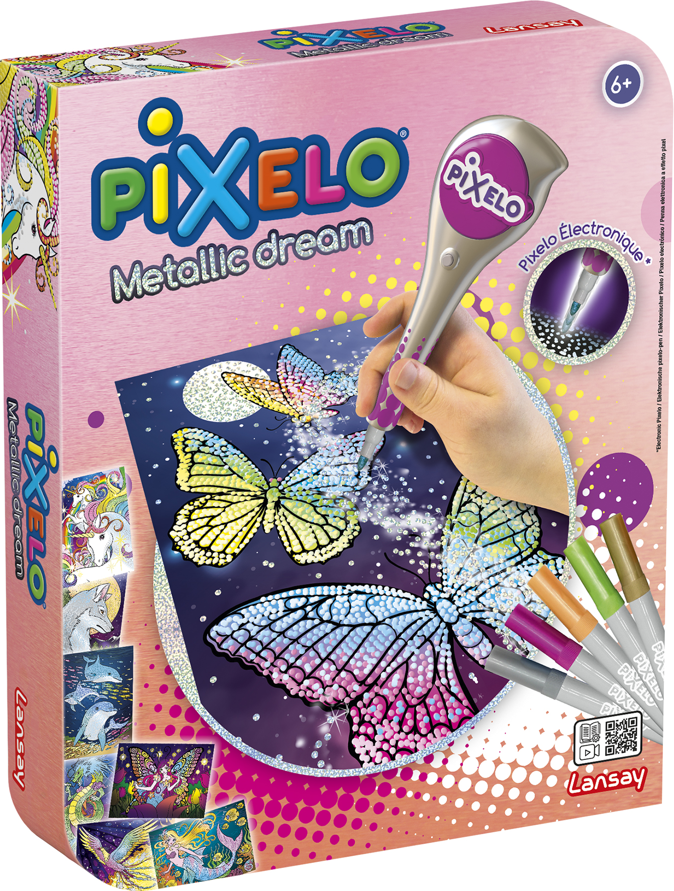 Crée de magnifiques dessins colorés en quelques instants avec ton stylo Pixelo électronique. Choisis ton illustration et utilise ton Pixelo électronique pour réaliser des motifs pointillés métalliques. Tu peux aussi utiliser ton feutre de façon classique pour finaliser ton dessin. Les couleurs ton dessin se révèlent peu à peu sous tes yeux ! Nouveau packaging ! Nouveau Pixelo éléctronique avec un design modernisé ! Fonctionne avec 1 pile LR03 non incluse. Dès 6 ans