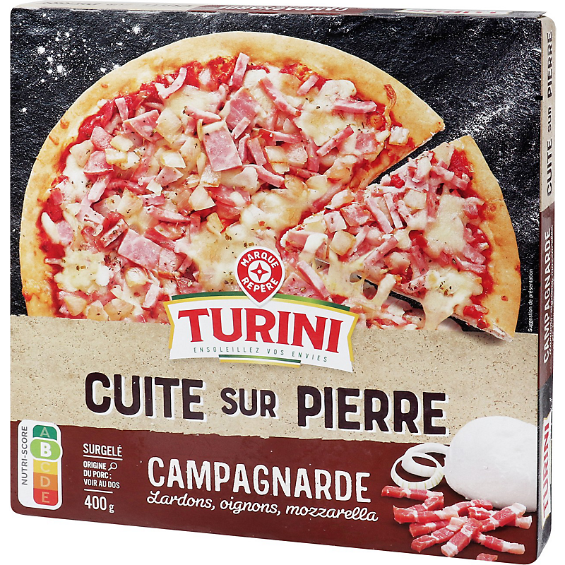 PIZZA À BASE DE LARDONS CUITS FUMÉS, D'OIGNONS, DE MOZZARELLA ET DE JAMBON CUIT STANDARD, AROMATISÉE - SURGELÉE TURINI