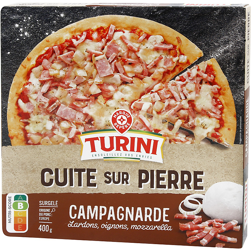 PIZZA À BASE DE LARDONS CUITS FUMÉS, D'OIGNONS, DE MOZZARELLA ET DE JAMBON CUIT STANDARD, AROMATISÉE - SURGELÉE TURINI