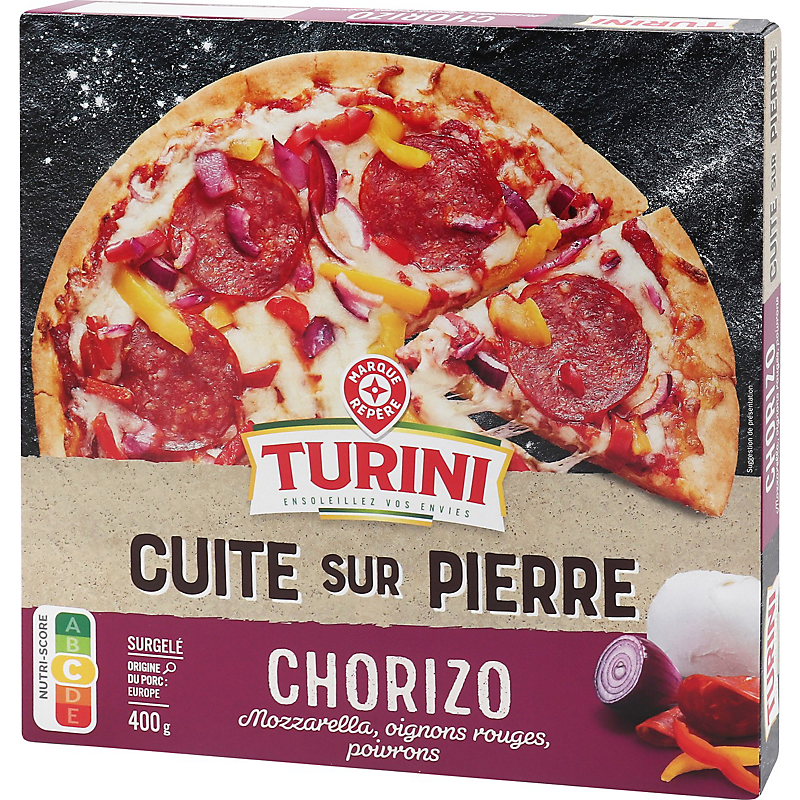 Pizza à base de chorizo choix fumé au bois de hêtre, d’édam, de mozzarella, d’oignons rouges, de poivrons rouges et de poivrons jaunes - Surgelée. TURINI