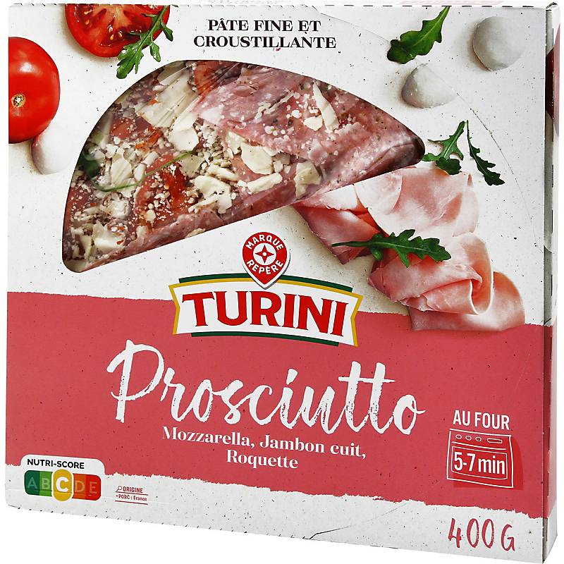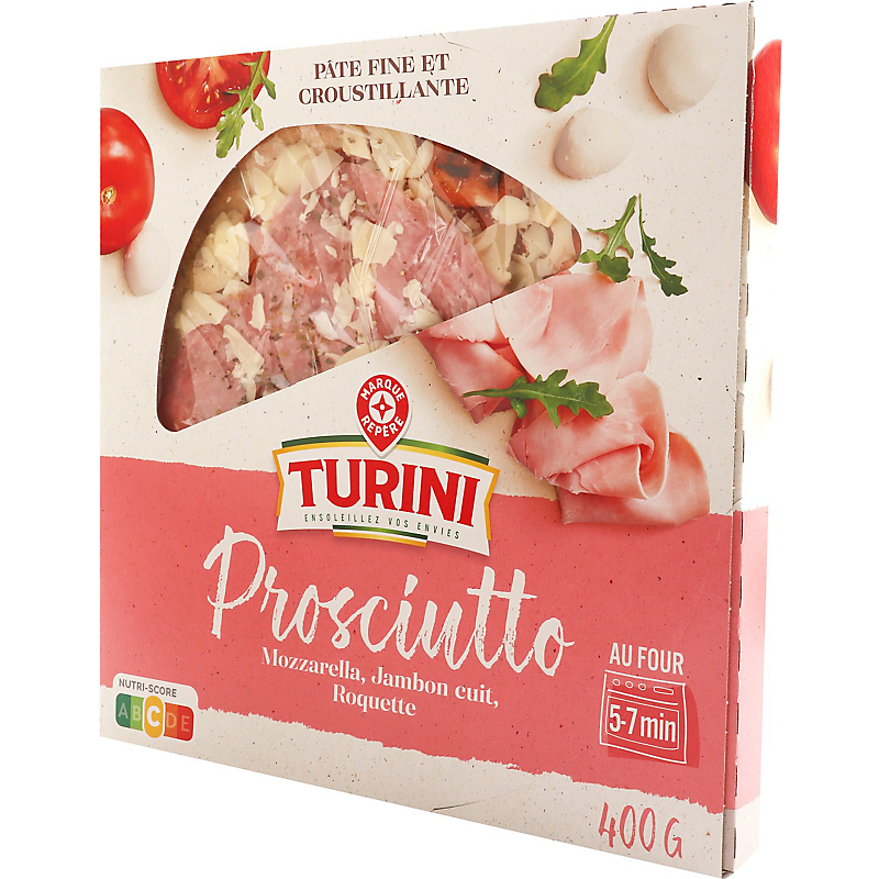 Pizza garnie de mozzarella, de jambon cuit standard, aromatisé, d'emmental et de roquette TURINI
