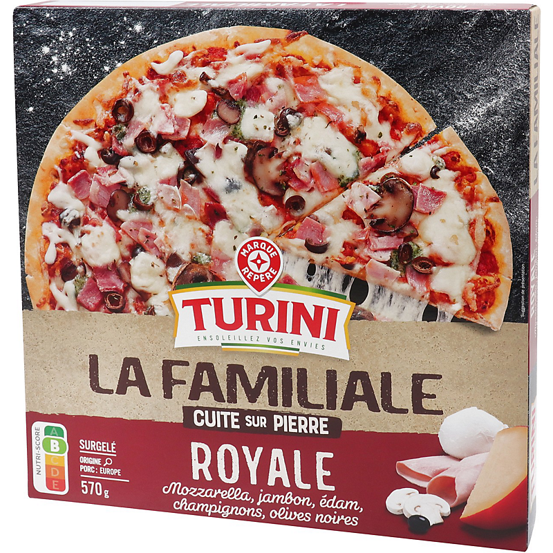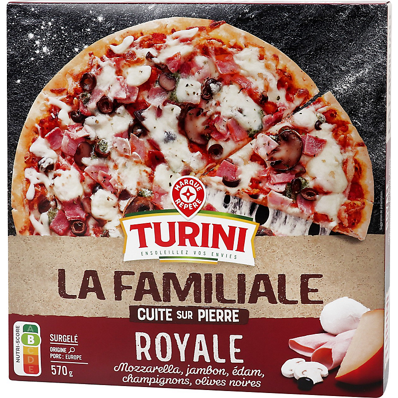 Pizza à base de mozzarella, de jambon cuit, d'édam, de champignons de Paris et d'olives noires confites - Surgelée. TURINI
