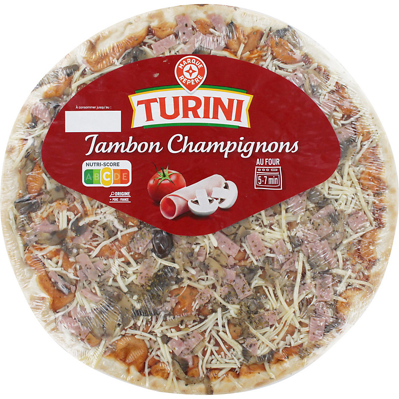 Pizza garnie de jambon cuit standard, aromatisé, de champignons de Paris, d'emmental, de mozzarella, et d'olives noires entières. TURINI