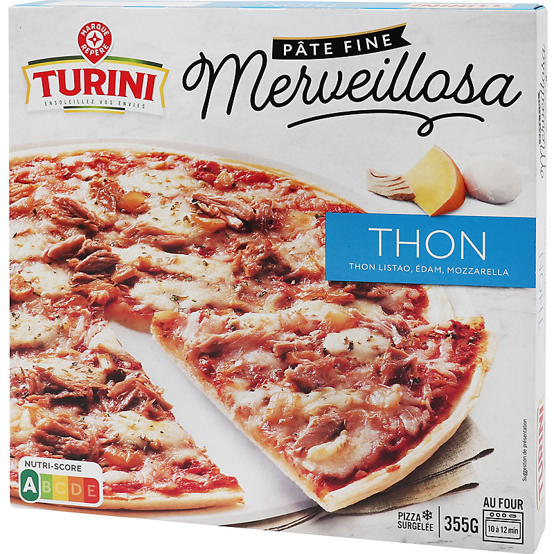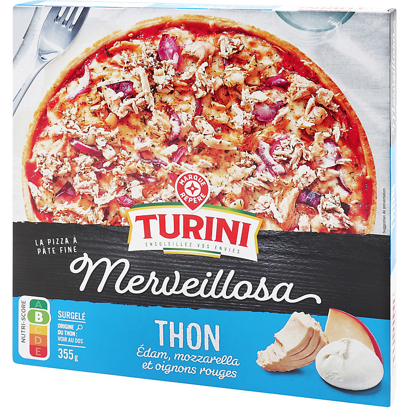 | Origine des principaux ingrédients | BLE (DE LA FARINE DE BLE) ORIGINE : EUROPE, THON PÊCHÉ EN: ZONES FAO 51, 71, 77 ET/OU 87*, LAIT (DE L'EDAM ET DE LA MOZZARELLA) ORIGINE : EUROPE, OIGNON ROUGE ORIGINE : EUROPE * SELON LES APPROVISIONNEMENTS ET/OU LES CARACTÉRISTIQUES GUSTATIVES RECHERCHÉES |