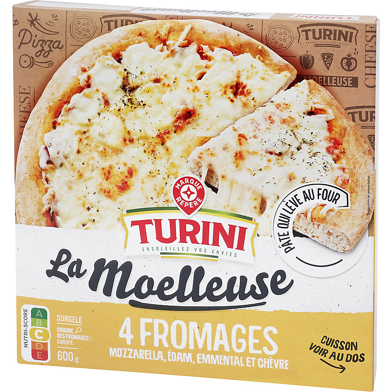 Pizza à pâte précuite à la mozzarella, édam, chèvre, emmental, fromage à pâte pressée non cuite Ballycashel et au pecorino - surgelée TURINI