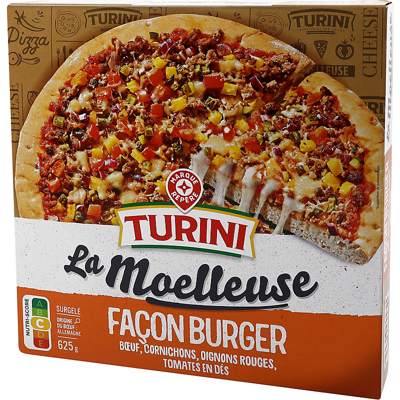 Ingrédients: Farine de blé 34,4 % ; eau ; purée de tomates 11,4 % ; emmental 9,6 % ; viande de bœuf cuite 7,3 % ; cornichons marinés 4 % (cornichons 3,6 %, vinaigre d'alcool, sel, sucre, extrait d'épices (dont moutarde)) ; oignons rouges 4 % ; tomates en dés 4 % ; huile de colza, poivrons jaunes 2,6 % ; levure ; crème fraîche ; dextrose ; sel ; lait fermenté ; sucre ; moutarde (eau, graine de moutarde, vinaigre d'alcool, sucre, sel, épices) ; épices ; vinaigre d'alcool ; amidons ; oignons rôtis (oignons, huile de tournesol) ; paprika fumé ; plantes aromatiques ; jus de légumes concentré (champignon, tomate, carotte, oignon, poivron, ail) ; ail ; huile de tournesol ; extrait d'épices (dont moutarde).