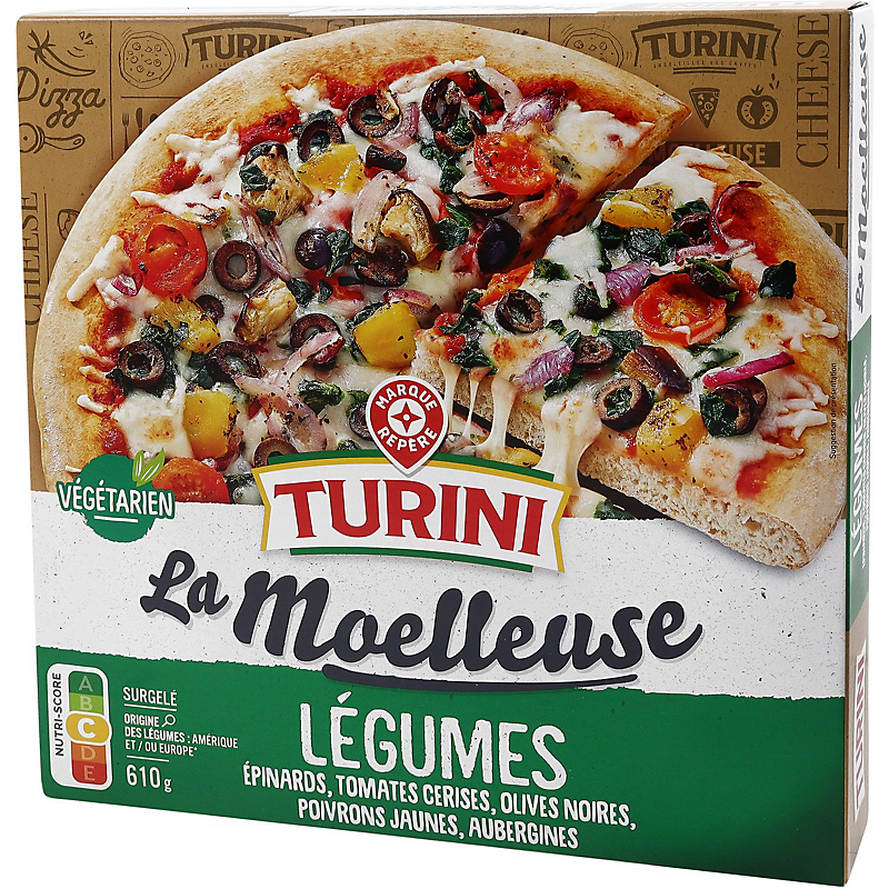 Pizza pâte précuite à base de mozzarella, d'épinards, de tomates cerises, d'olives noires confites, de poivrons jaunes grillés marinés, d'oignons rouges et d'aubergines grillées - Surgelée. TURINI