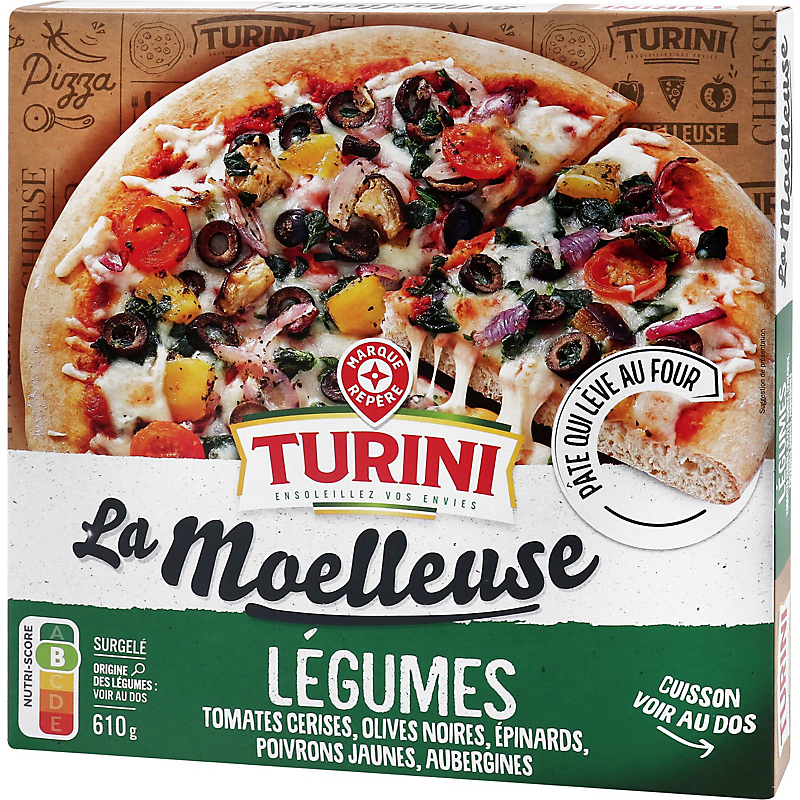 Ingrédients: Farine de blé 35,4 % ; eau ; purée de tomates 13,1 % ; mozzarella 8,5 % ; épinards 4,9 % ; tomates cerises 4,3 % ; olives noires confites 3,2 % (olives noires 3,1 %, sel) ; huile de colza ; poivrons jaunes grillés marinés 2,9 % (poivrons jaunes 2,6 %, huile de tournesol, sucre, sel, jus de citron concentré, épices) ; oignons rouges 2,9 % ; levure ; aubergines grillées 1,4 % ; dextrose ; sel ; plantes aromatiques ; fromage à pâte dure ; sucre ; ail ; huile d'olive vierge extra ; amidon de pois ; amidon de pomme de terre ; poivre.
