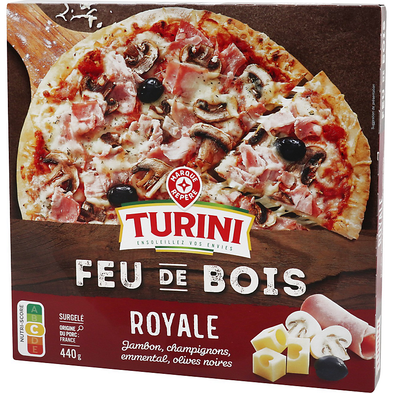 Pizza à base de jambon cuit supérieur, champignons de Paris, emmental et olives noires entières - Surgelée TURINI