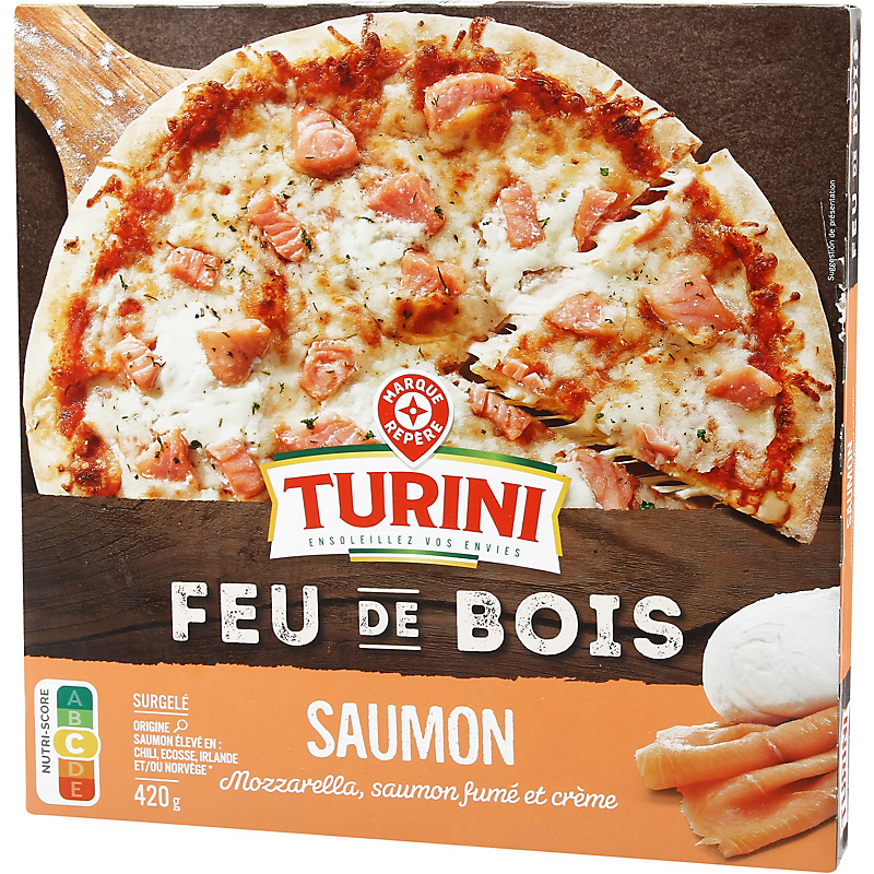 Ingrédients : Farine de blé 32,9 % ; purée de tomates mi-réduite 22 % ; eau ; mozzarella râpée 11,9 % (lait pasteurisé, amidon de pomme de terre, sel, ferments lactiques, coagulant) ; saumon fumé 10,7 % (saumon (Salmo salar), sel) ; crème liquide 5,9 % (dont stabilisant : carraghénanes) ; huiles végétales (tournesol, colza, en proportion variable) ; levure boulangère ; sel ; plantes aromatiques ; épices ; sucre.