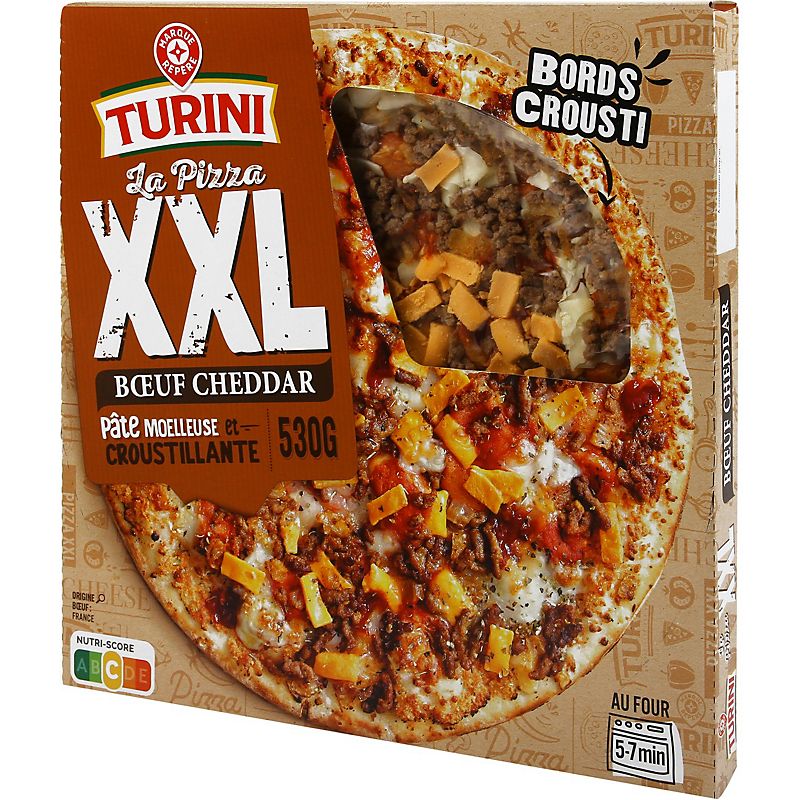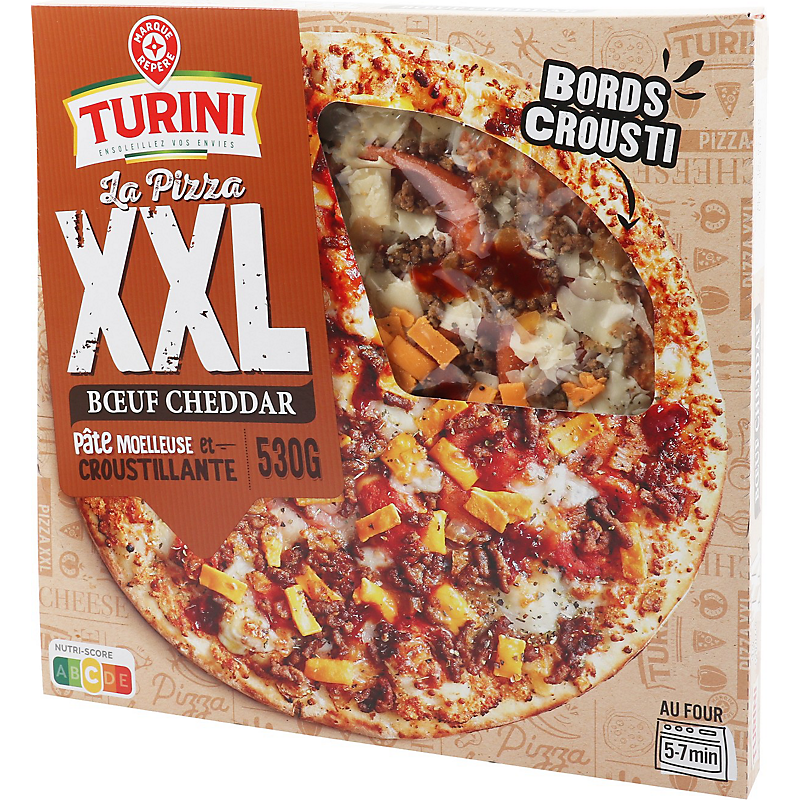Pizza garnie de mozzarella, de préparation de viande hachée de bœuf cuite, de tomato ketchup, de cheddar fondu, aromatisée goût barbecue et goût bœuf grillé. TURINI