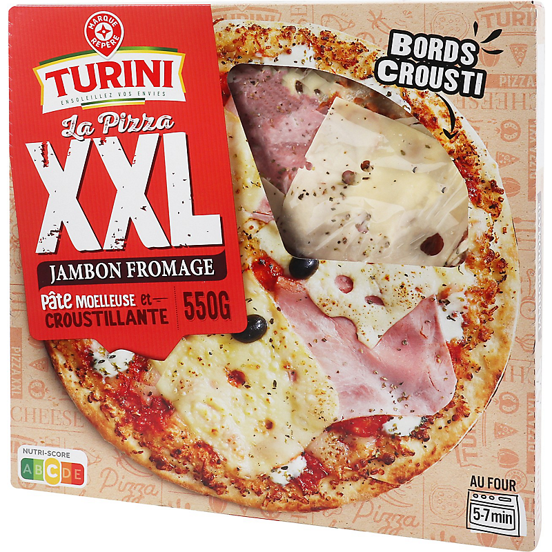 Pizza garnie de mozzarella, d'emmental, de jambon cuit standard et d'olives noires entières TURINI