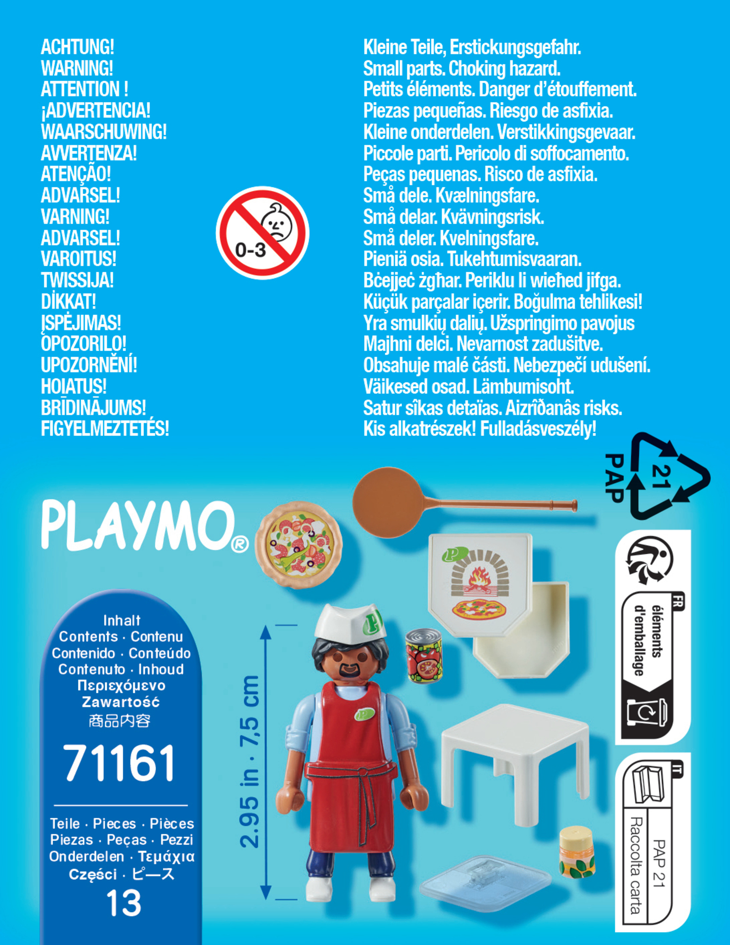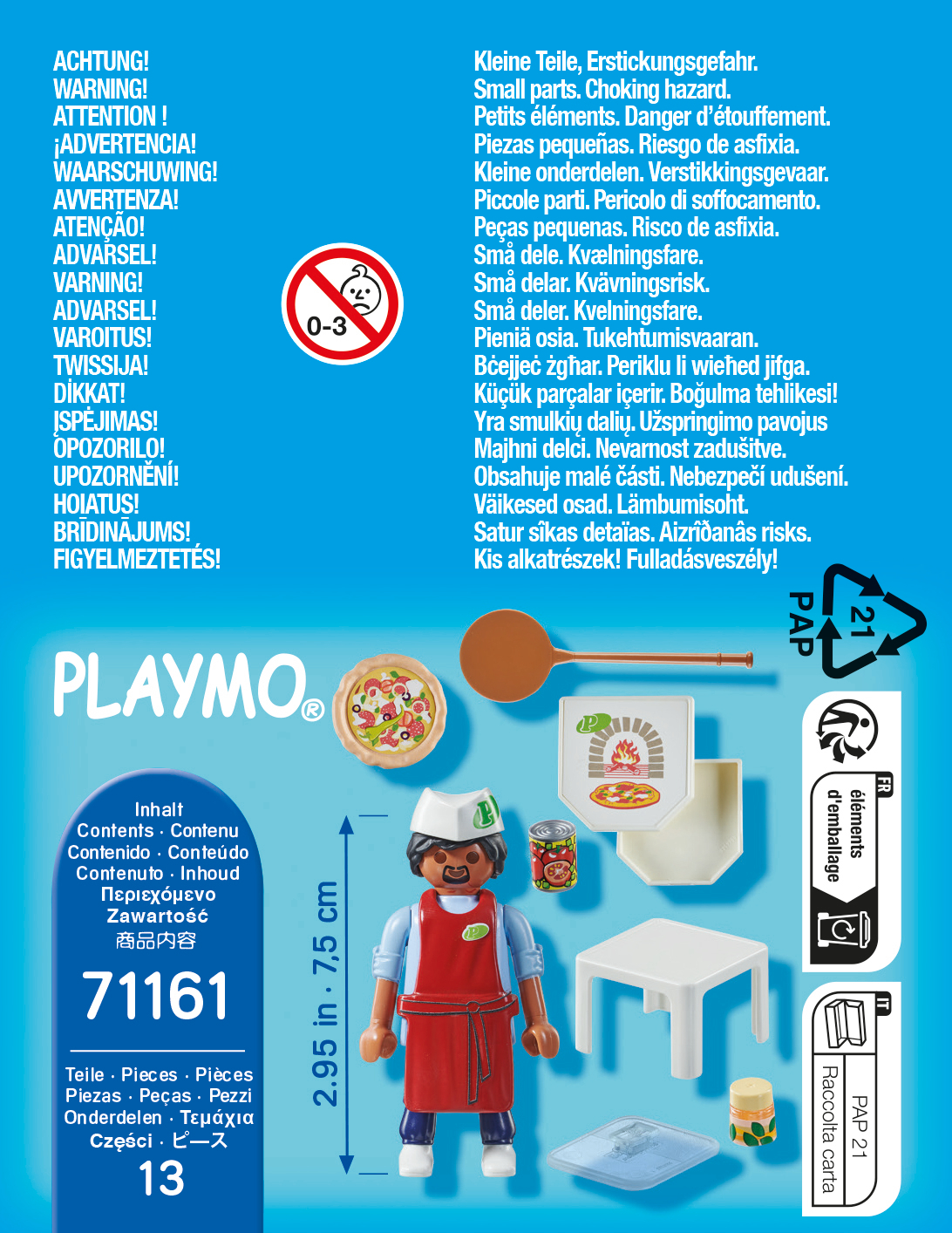Le Pizzaiolo Playmobil cuisine ses pizzas avec soin et goût pour que ses clients puissent se régaler ! Contient un personnage et des accessoires de pizzaïolos. 13 pièces.