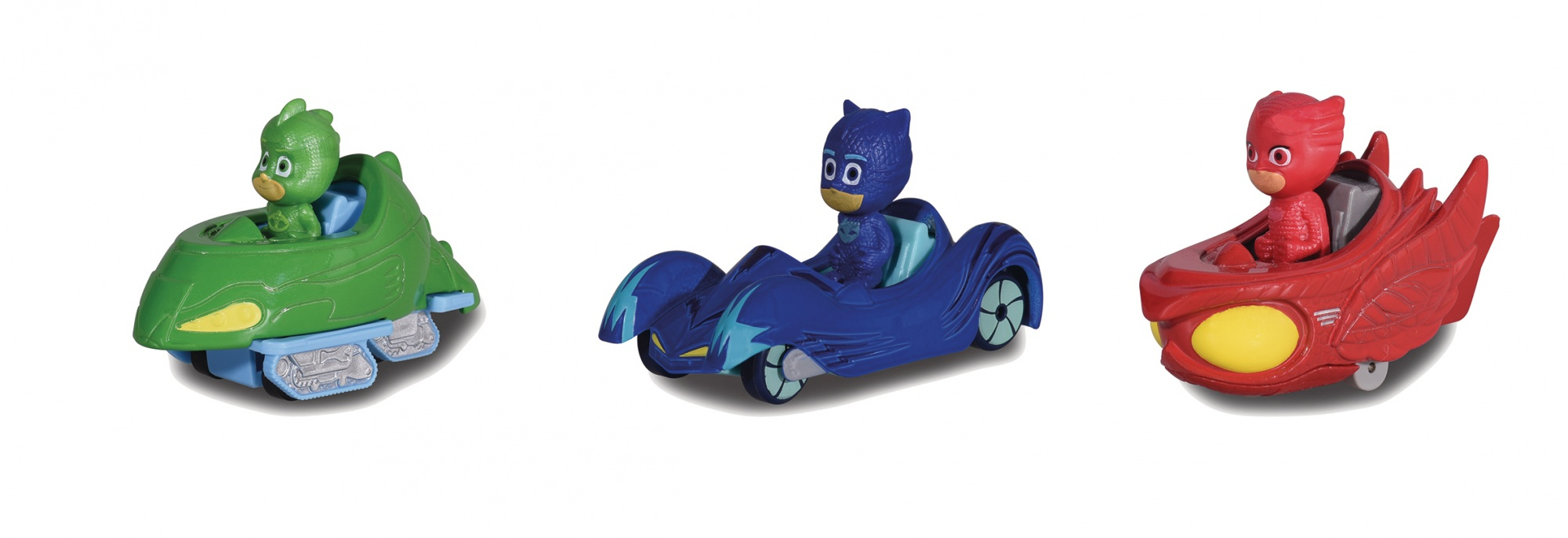 Coffret de 3 véhicules en métal avec 3 figurines à léchelle 1/64ème à leffigie des personnages de la série PJ Masks : YoYo, GluGlu, et Bibou.