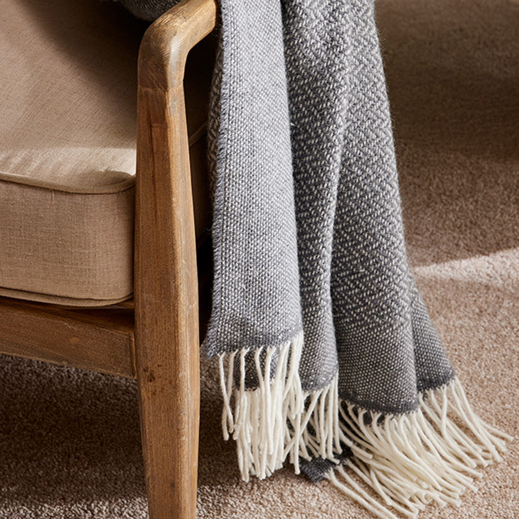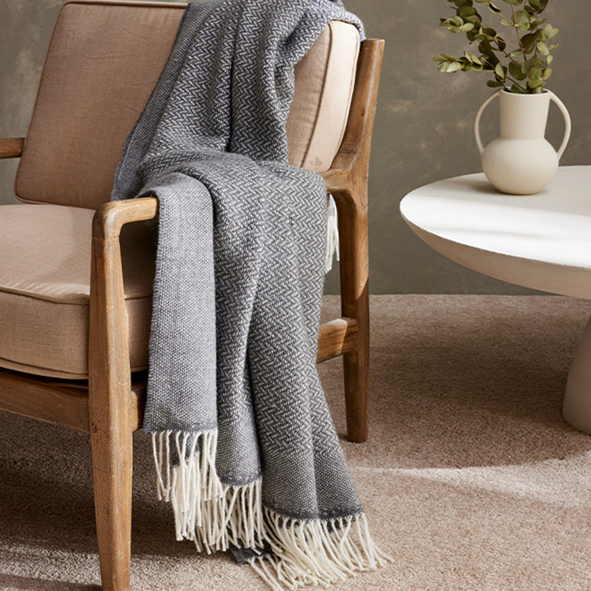 Avec son motif chevron et ses franges sur les deux côtés, il sera tout aussi élégant porté sur vos épaules que posé en décoration sur la canapé.