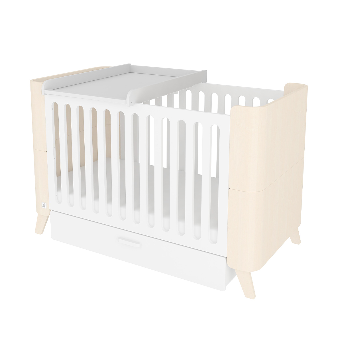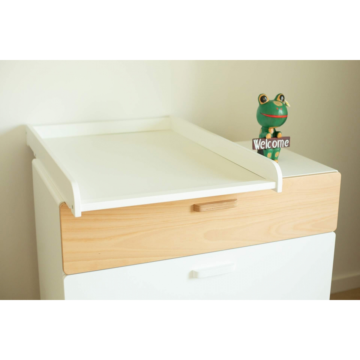 Le plan à langer universel Hoppa, de la marque Bellamy, permet d’accéder facilement au premier tiroir de la commode Hoppa, de la même collection.