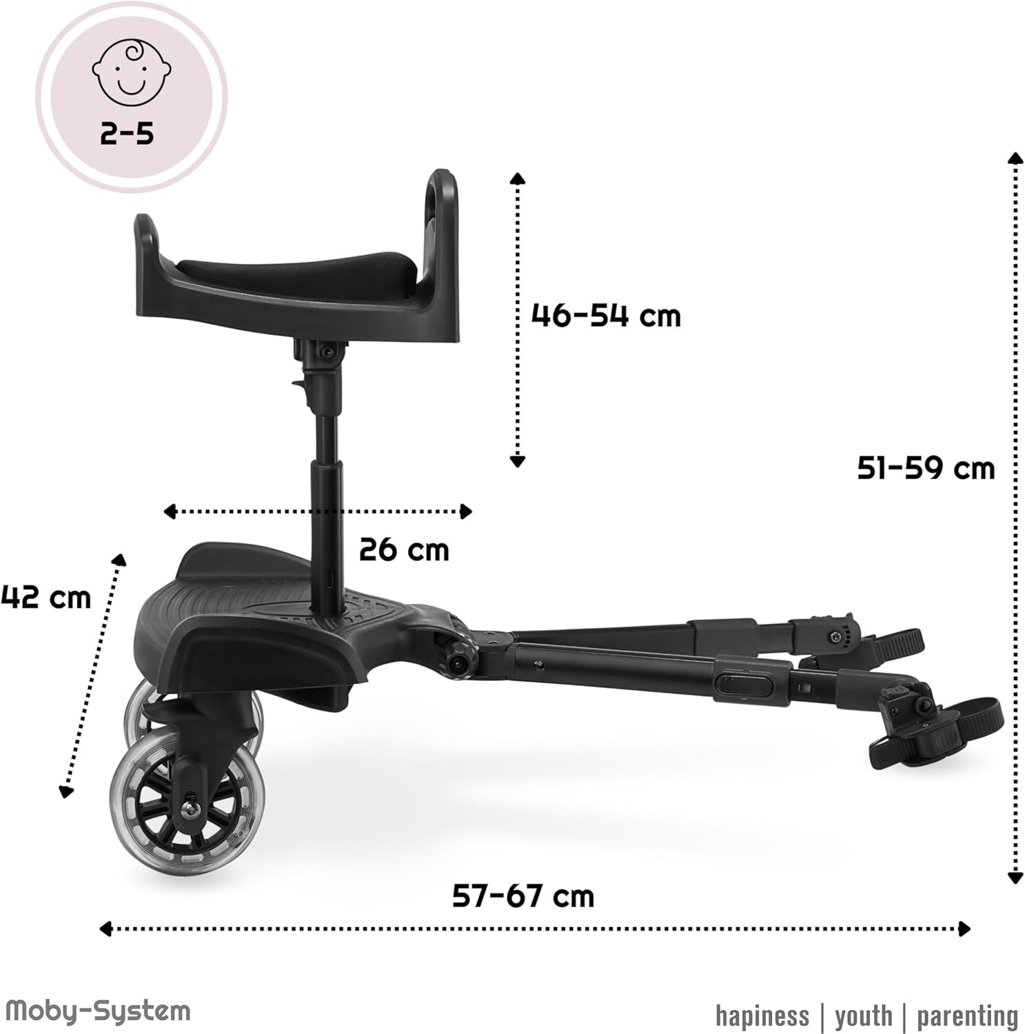 Cet accessoire pour poussette s'adapte à toutes les poussettes standard du marché. En effet, il est doté d'un système de fixation universel qui le relie aux châssis verticaux et horizontaux. La suspension amortie garantit une conduite souple et confortable et la plate-forme antidérapante augmente la sécurité. Il est conçu pour les enfants de 2 à 5 ans environ. Les roues pivotent à 360 degrés pour faciliter la conduite. Le siège confortable, quant à lui, garantit le confort de l' enfant pendant la promenade.